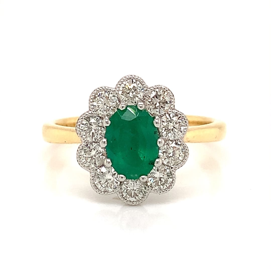 A beautiful yellow gold ring claw set with a an oval cut emerald within a beaded edge white gold ring top set with bright brilliant cut diamonds. Metal: 18 Carat Yellow and White Gold Assessed Emerald Weight: 0.69 Carat Assessed Total Diamond Weight: 0.65 Carat Ring Top Dimensions: 12.5 x 11 mm Finger Size: N [...]