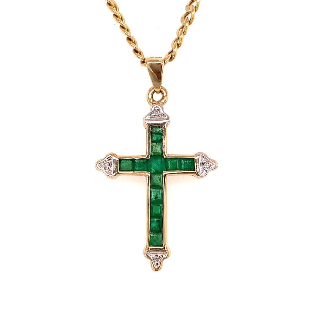 A pretty trefoiled gold cross, fully channel set with square cut emerald. Inset with small diamonds within the trefoils. With a hollow link filed curb chain. Metal: 9 Carat Yellow Gold Cross Height: 23 mm – Excludes rings. Chain Length: 19 Inches As a pre-owned item, this necklace has been examined and professionally cleaned and …