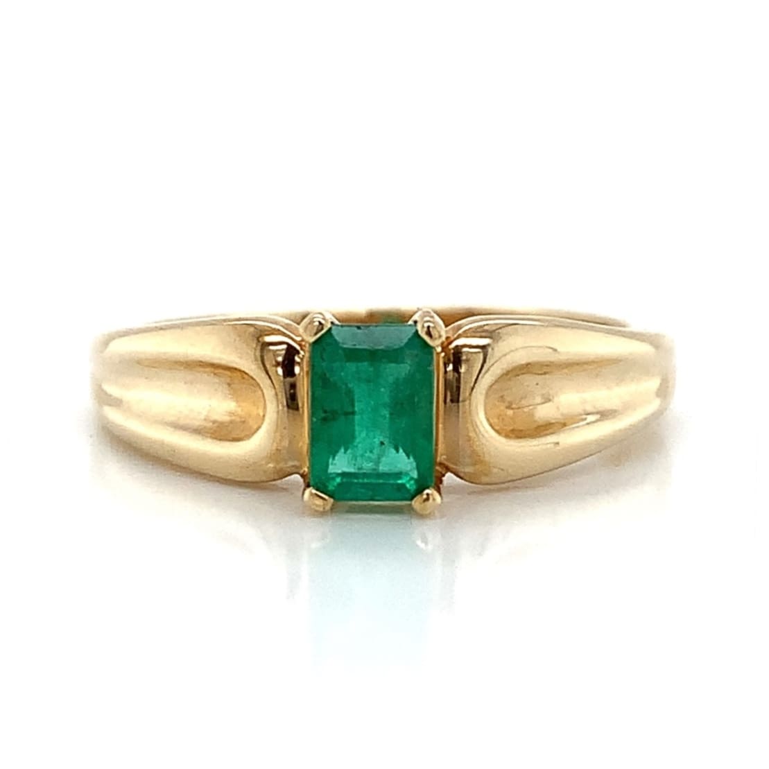 A rich emerald claw set in a wide shouldered gold ring. Metal: 9 Carat Yellow Gold Date: Modern Width: 6.6 mm Current Finger Size: Q This item has been thoroughly checked, cleaned and polished by our workshop. Gift Boxed