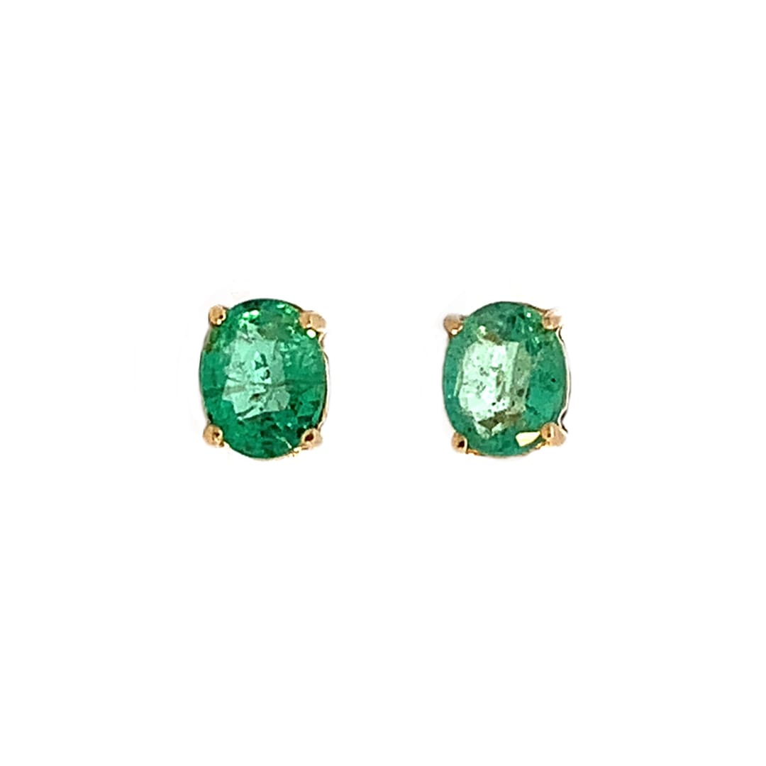 Small oval emerald stud earrings with clawed settings. Metal: 9 Carat Yellow Gold Stud Dimensions: 5 x 4 mm Fittings: Posts and Scroll Backs. As a pre-owned item, these earrings have been examined and professionally cleaned and polished in our workshop. Gift Boxed