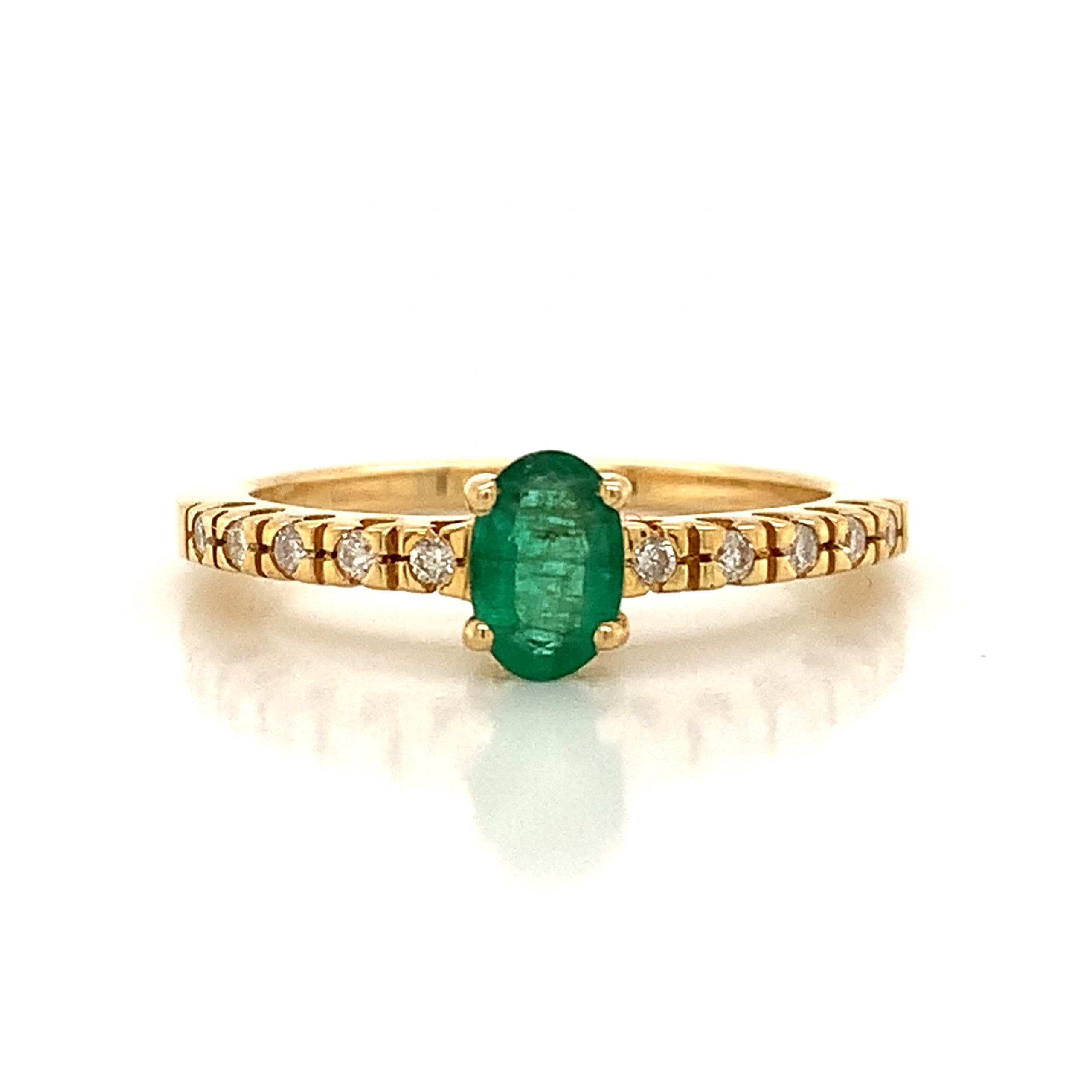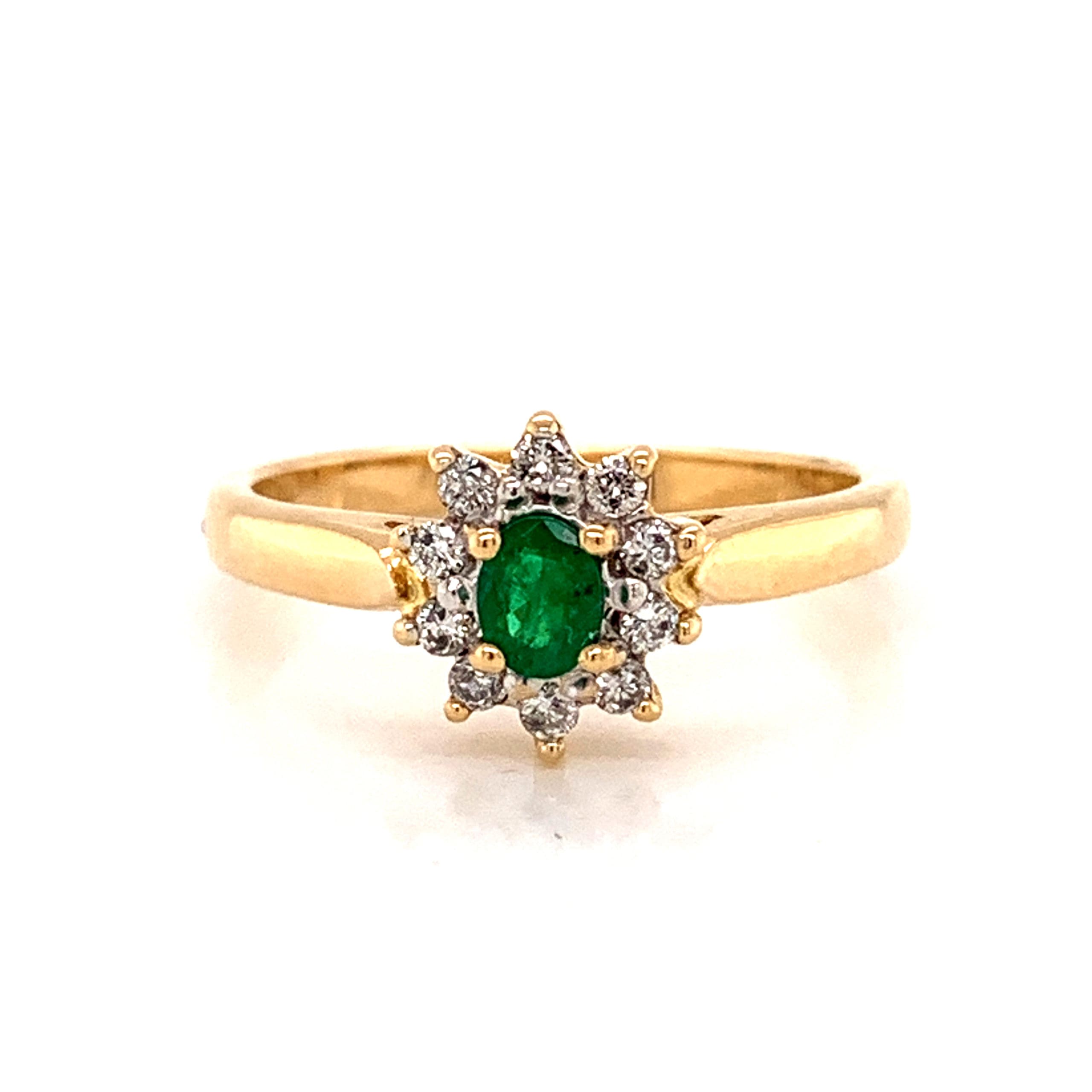 This pretty yellow gold ring is claw set with an oval cut emerald and inset with small round diamonds across the shoulders. Metal: 18 Carat Yellow Gold Emerald Dimensions: 5.8 x 4.2 mm Current Finger Size: M This item has been thoroughly checked, cleaned and polished by our workshop. Gift Boxed