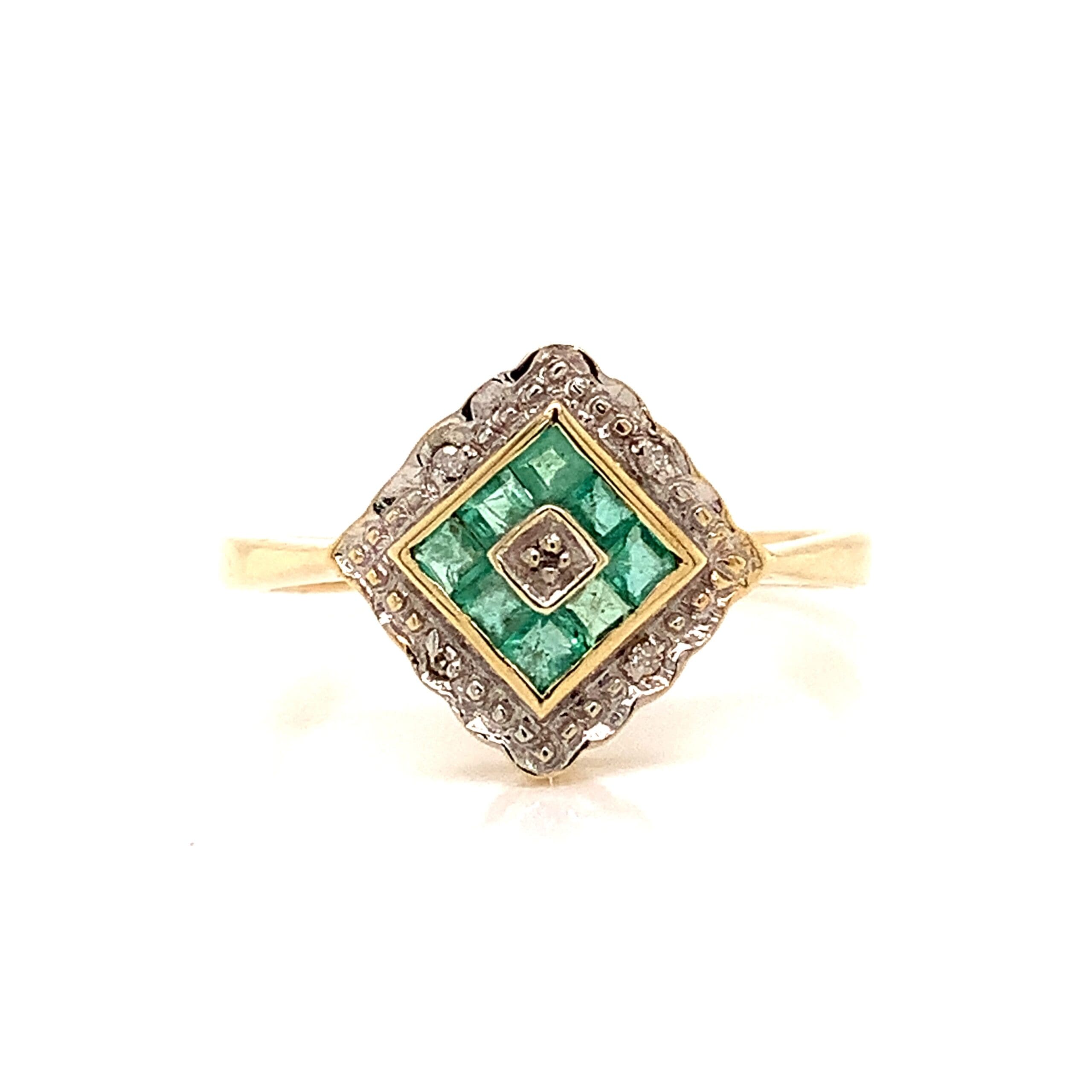 A pretty low porfile ring featuring a square of calibre cut emeralds and an illusion border set with four small round cut diamonds. Metal: 9 Carat Yellow Gold Date: Modern Ring Width: 12 mm Current Finger Size: P As a pre owned item, this ring has been examined and professionally cleaned and polished in our [...]