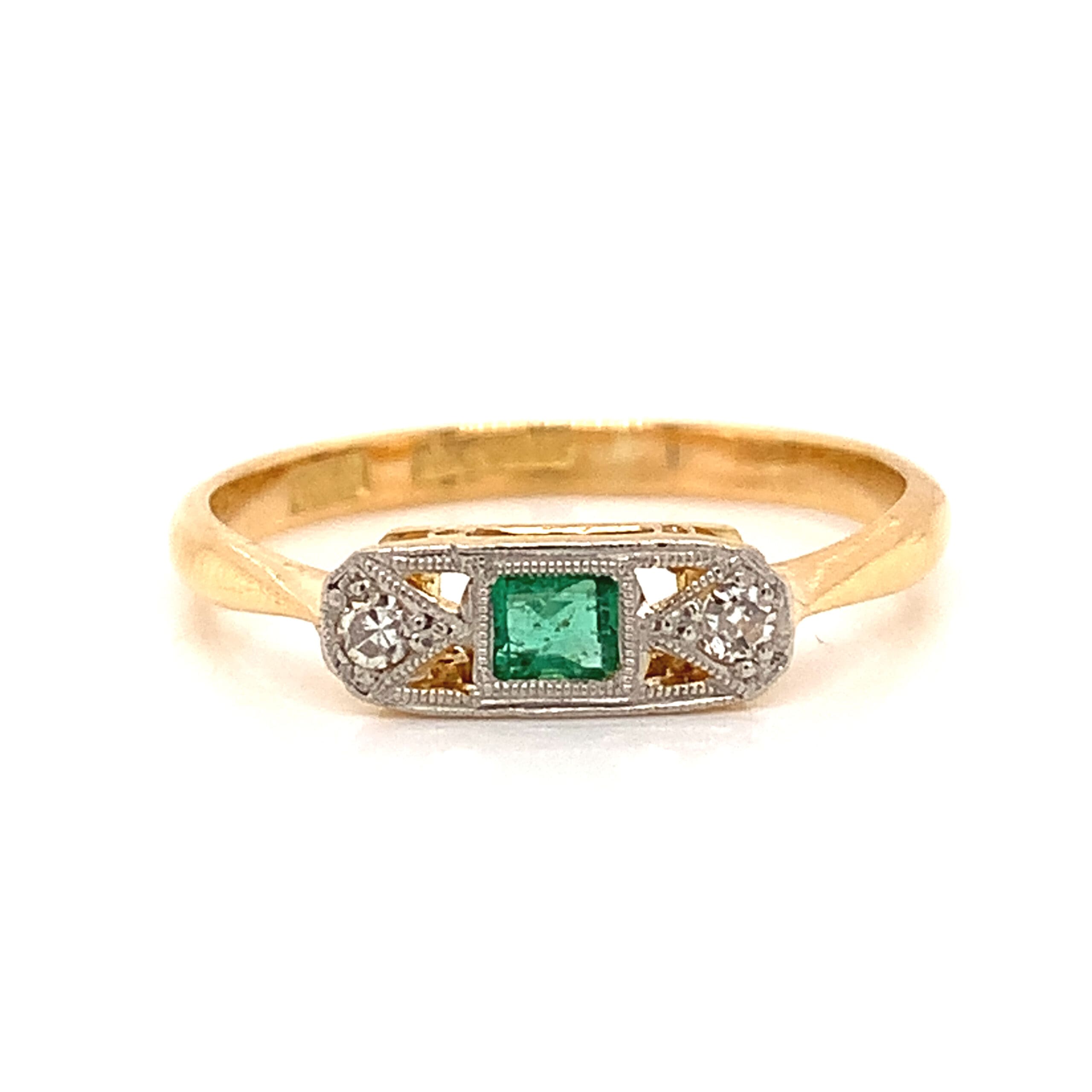This elegant deco ring is grain set with an emerald cut emerald a pair of bright round cut diamonds. Metal: 18 Carat Yellow Gold Width: 4.2 mm Current Finger Size: P This item has been thoroughly checked, cleaned and polished by our workshop. Gift Boxed