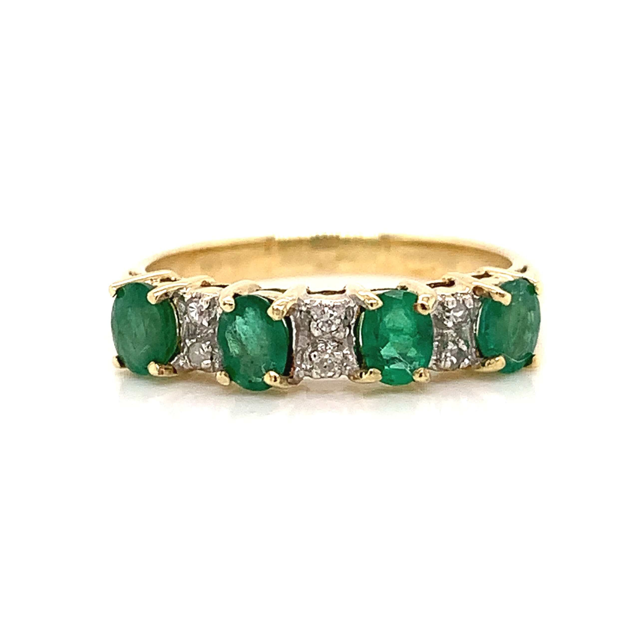 This eternity style ring is claw set with four oval cut emeralds with small round cut diamonds between. Made with a sturdy ring shank. Metal: 9 Carat Yellow Gold Width: 4 mm Current Finger Size: L This item has been thoroughly checked, cleaned and polished by our workshop. Gift Boxed