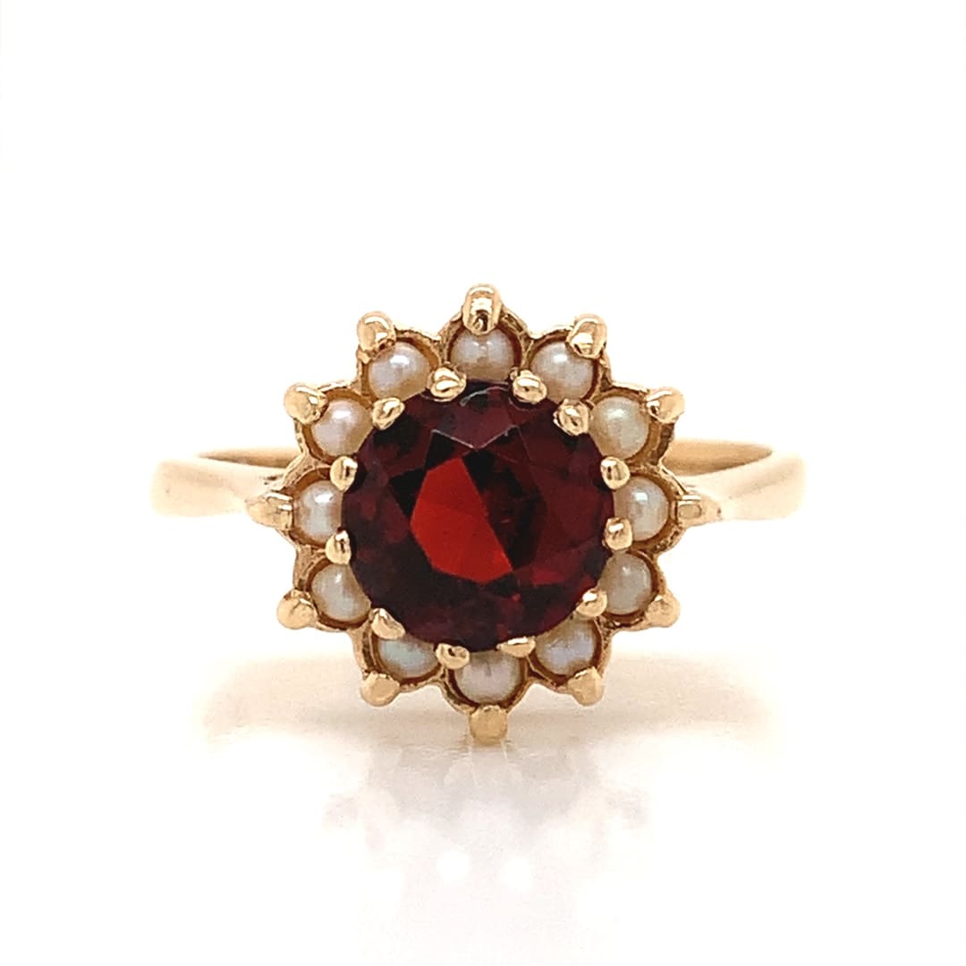 This pretty dress ring is claw set with a round faceted garnet and seed pearls. Metal: 9ct Yellow Gold Ring Width: 11 mm Finger Size: L – This ring is unsuitable for resizing. As a preowned item this ring has been examined and professionally cleaned and polished in our workshop. Gift Boxed