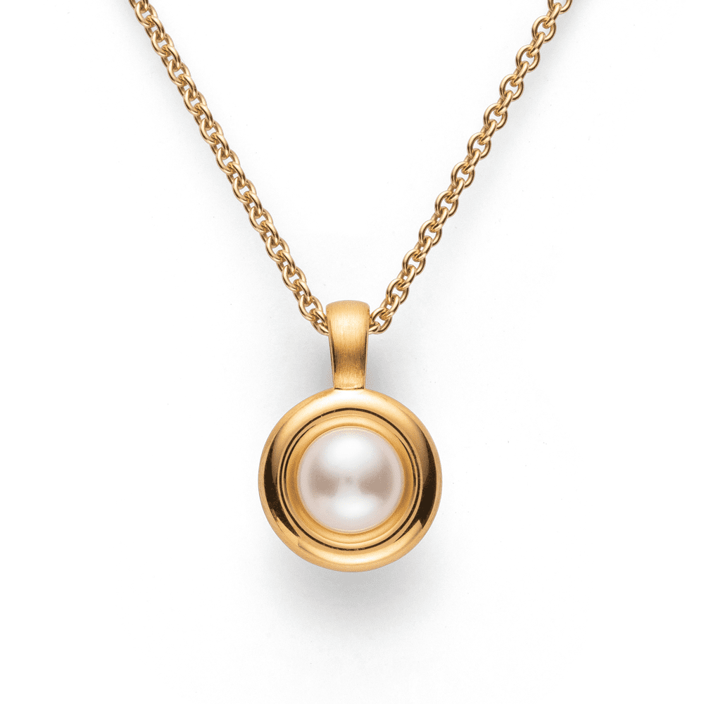 This noble, gold-plated pendant made of satin matt and polished 925/- sterling silver brings the white cultured pearl (1.46 ct) out as a symbol of endless beauty. A simple and at the same time elegant jewellery design by the designer Nadine Resch. Also available in combination with the matching ear studs, the matching ring and …