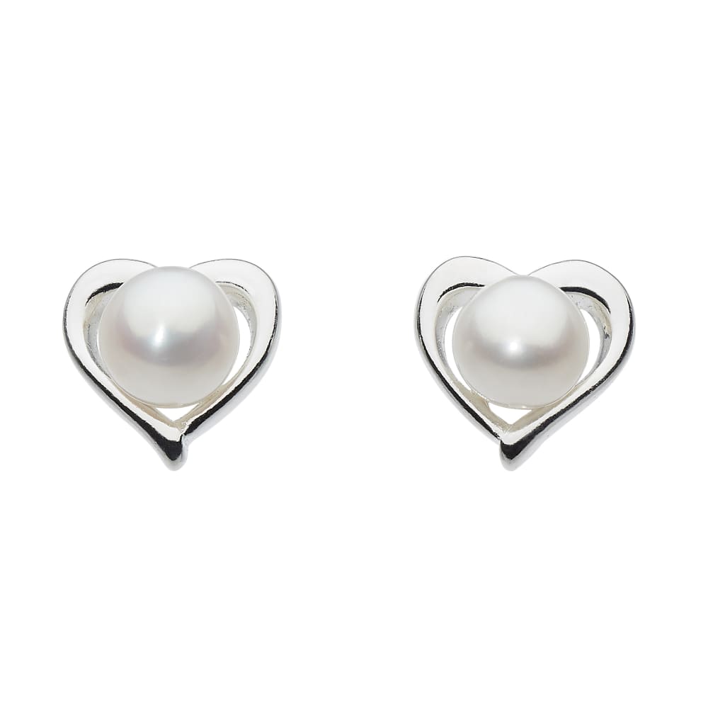 These pretty sterling silver heart stud earrings are set with white button shaped cultured pearls. Height: 7mm Comes with Dew packaging.