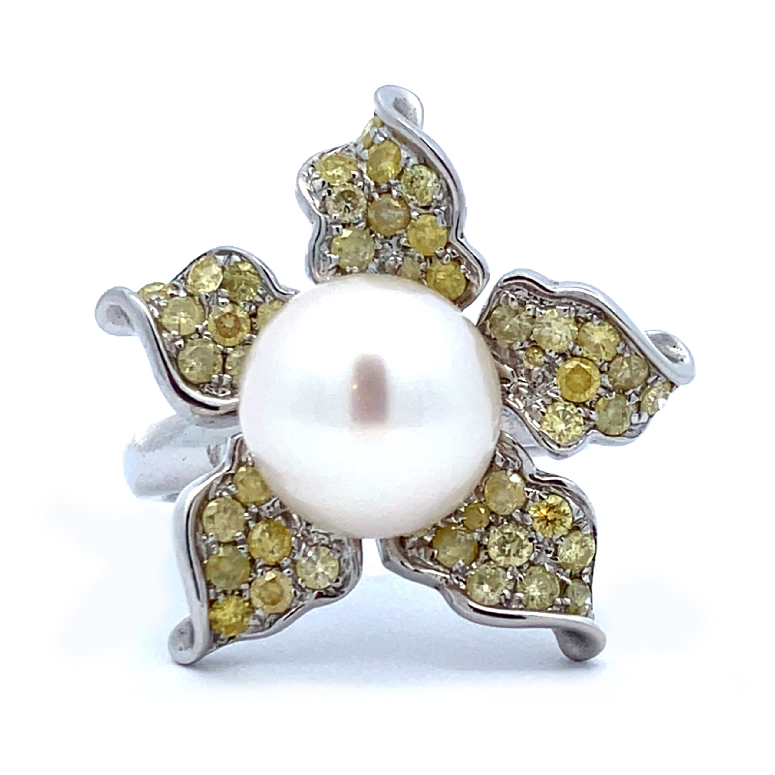 A flamboyant pearl and yellow diamond cocktail ring. A large triple A grade cultured pearl surrounded by flower petals pave set with fancy yellow diamonds. Metal: 18 Carat White Gold Finger Size: P Total Diamond Weight: 0.73 Carat Pearl size: 9.75mm in Diameter Gift Boxed