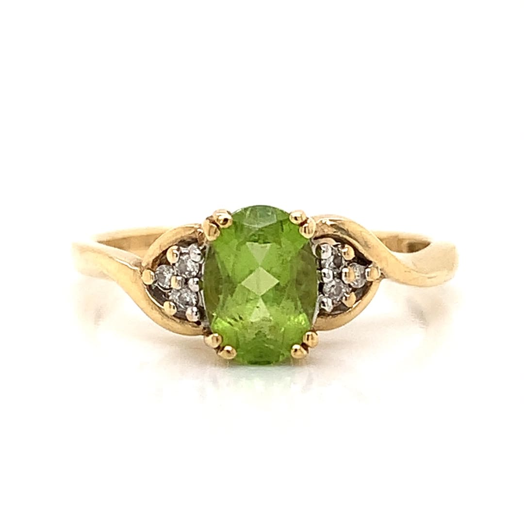 A pretty twist design ring, claw set with an oval cut peridot and six small accent diamonds. Metal: 9 Carat Yellow Gold Ring Width: 7 mm Finger Size: L As a pre owned item, this ring has been examined and professionally cleaned and polished in our workshop. Gift Boxed