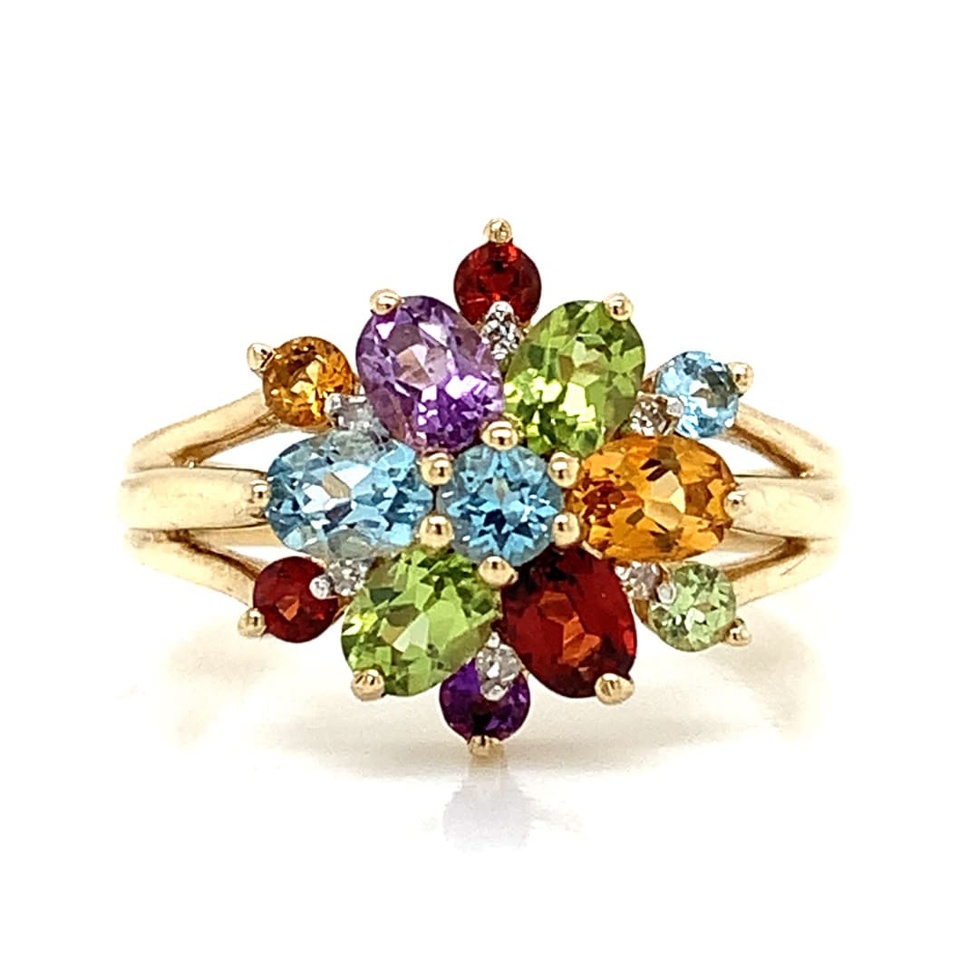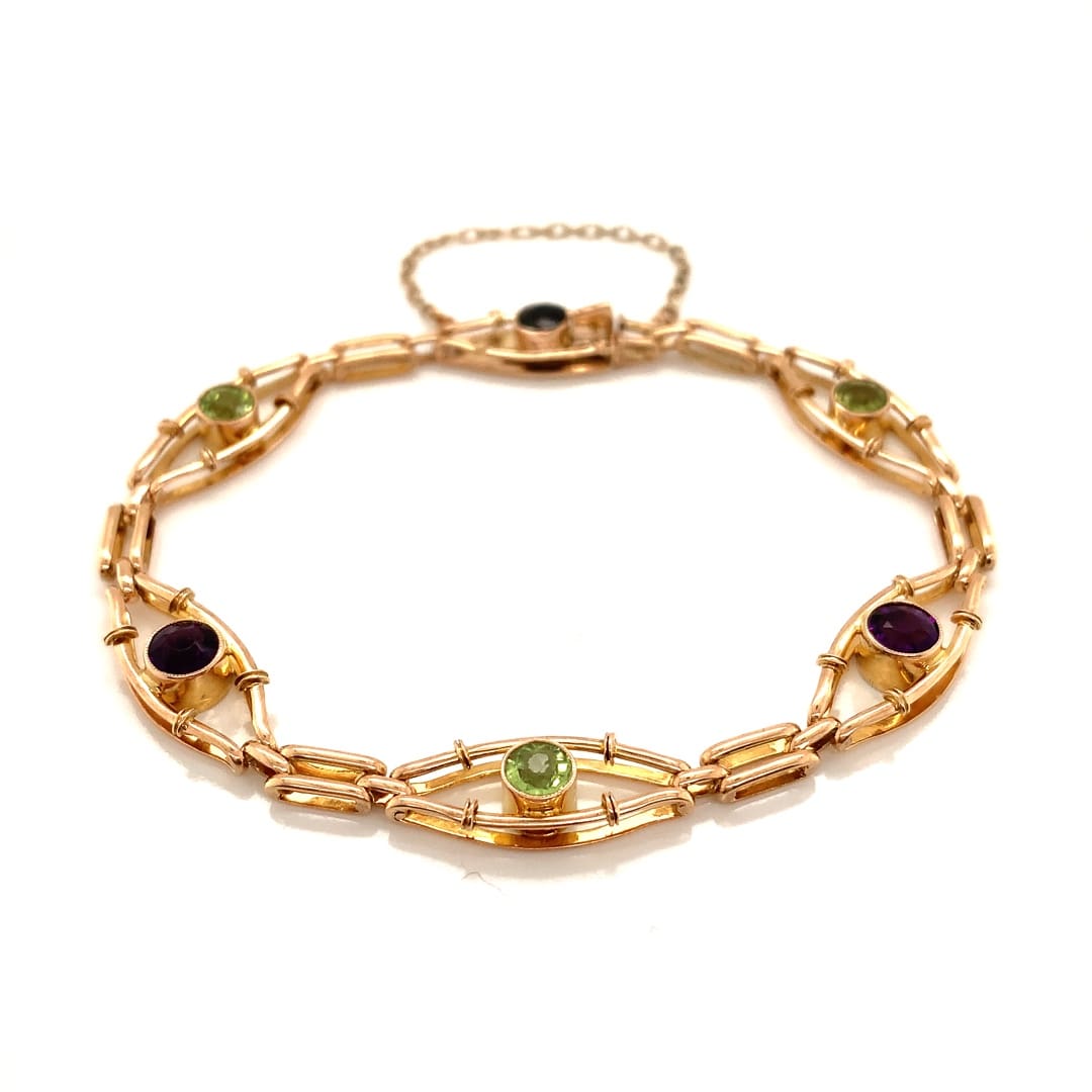 This pretty yellow gold dress necklace comprises oval faceted amethyst, peridot, garnet and topaz gemstones all in spectacle settings. Excellent condition. Metal: 18 Carat Yellow Gold Length: Adjustable 16 / 17 / 18 Inches Width: 8 mm As a pre-owned item this necklace has been thoroughly checked and cleaned in our workshop. Gift Boxed