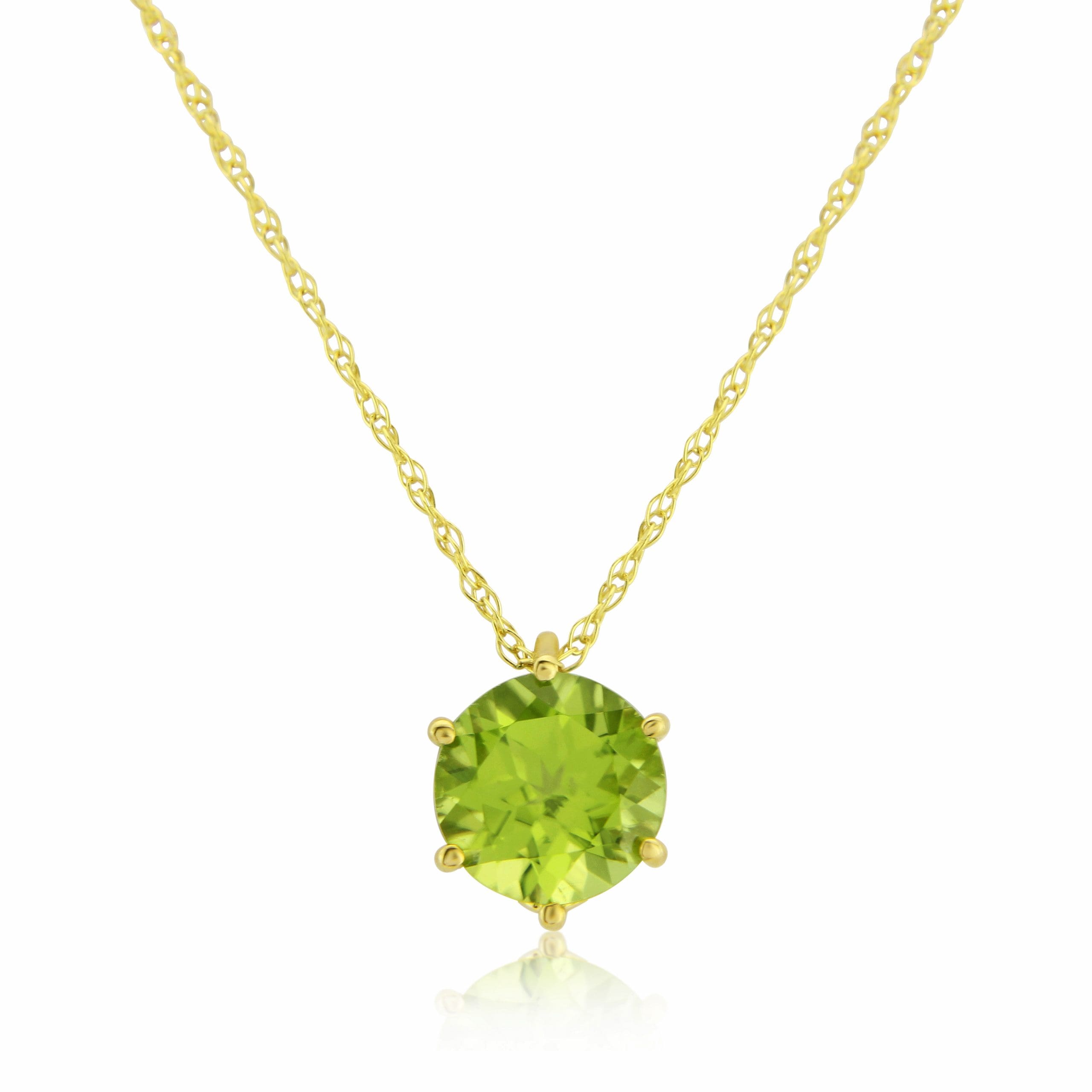 A gold pendant and chain with a round faceted peridot in a pretty clawed setting. Metal: 9ct Yellow Gold Pendant Width: 7 mm Chain: Adjustable – 16 or 18 Inches Gift Boxed