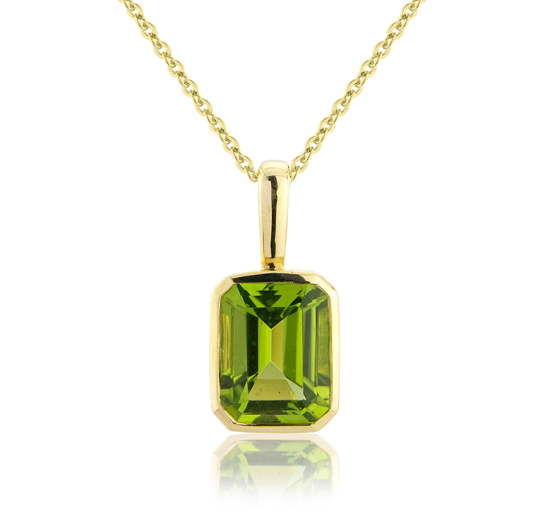 A smooth gold pendant and chain with a beautiful emerald cut peridot in a rub-over setting. Metal: 9ct Yellow Gold Pendant Width: 7.2 mm Chain: Adjustable – 16 or 18 Inches Gift Boxed
