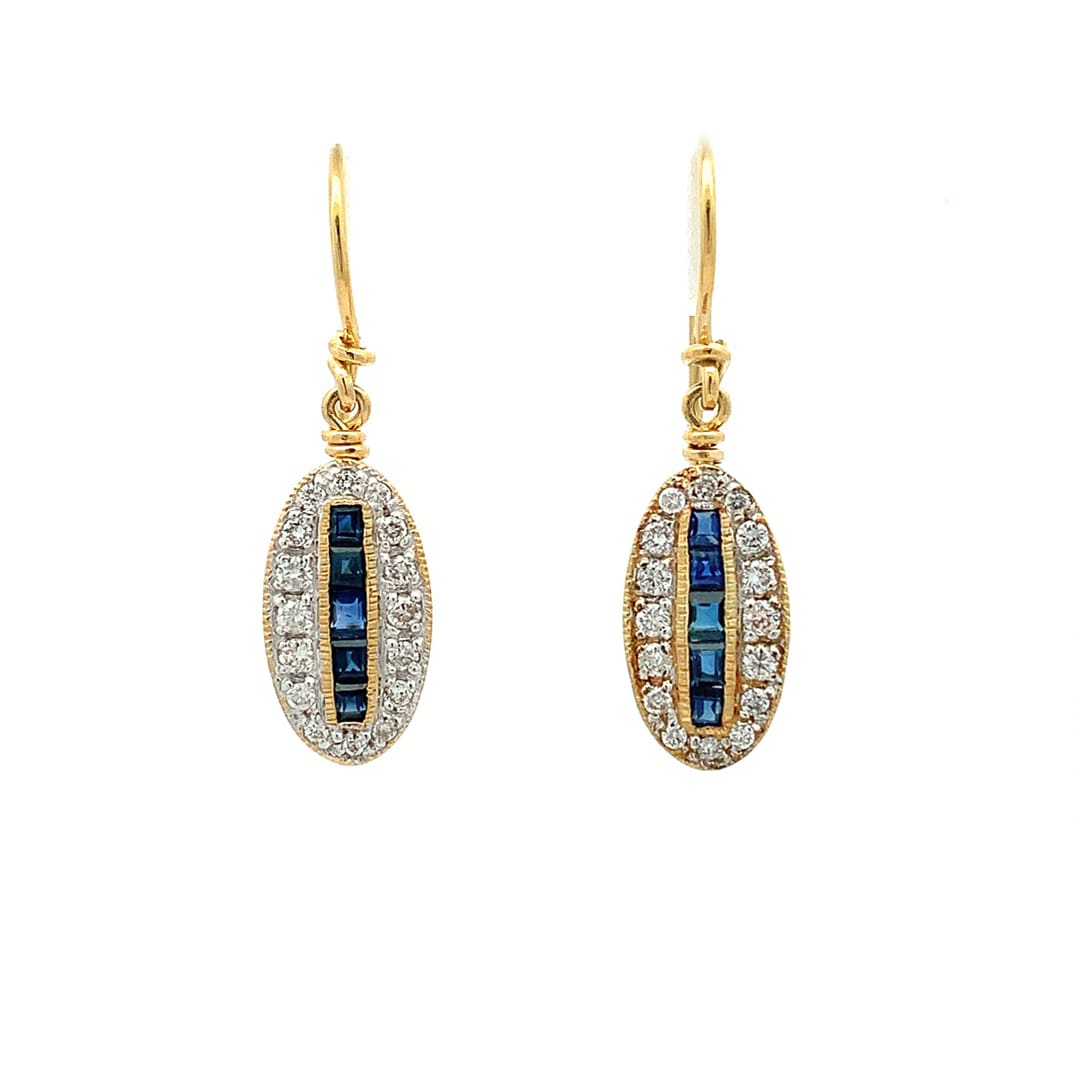 Beautiful yellow gold drop earrings with oval pendants set with calibre cut blue sapphire with diamond pave surrounds. Date: Circa 1980 Total Length: 30mm Fittings: Hooks As a preowned item, these earrings have been examined and professionally cleaned and polished in our workshop. Gift Boxed