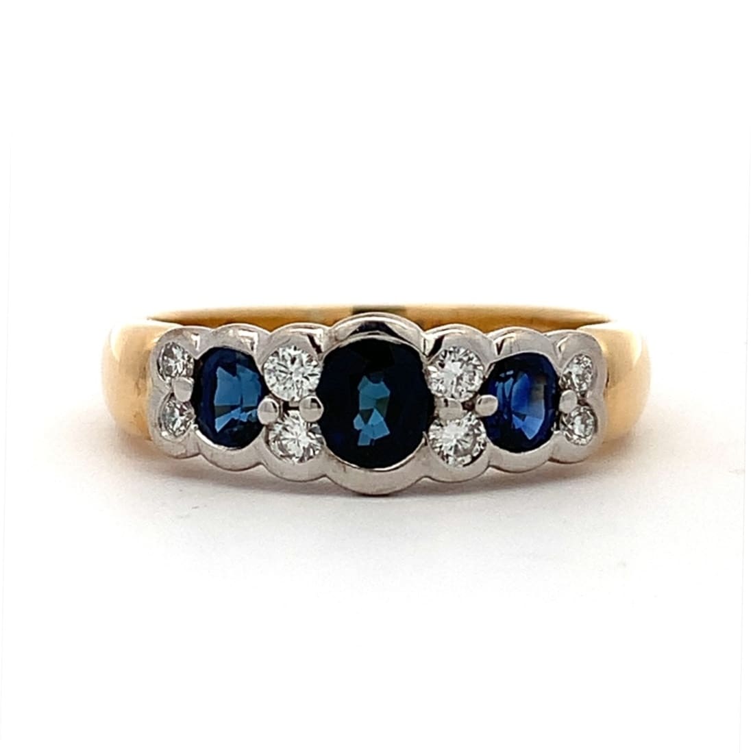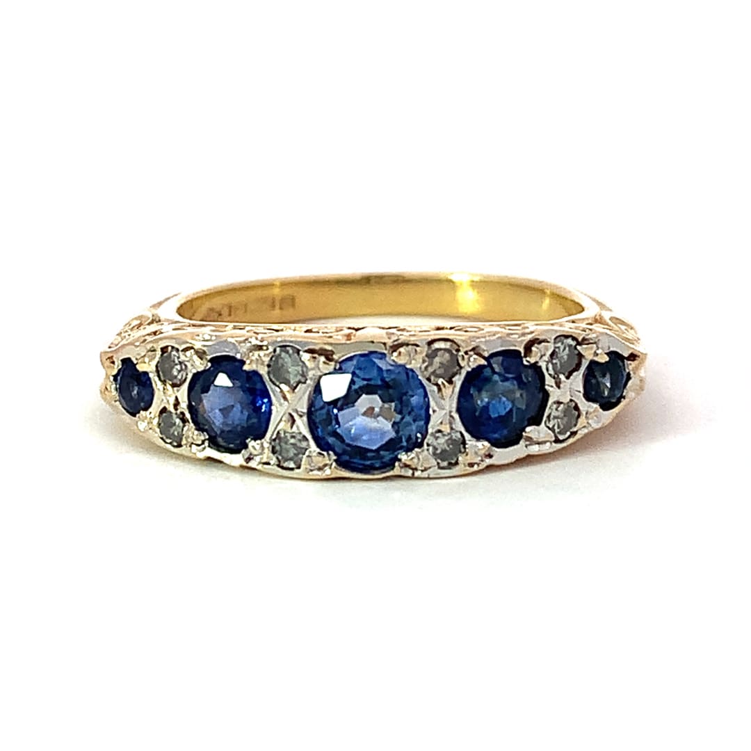 A carve style ring featuring a row of round cut blue sapphire with small accent diamonds. Metal: 9 Carat Yellow & White Gold Hallmark: Sheffield 1988 Assessed Total Blue Sapphire Weight: 0.75 Carat Assessed Total Diamond Weight: 0.06 Carat Current Finger Size: M Width: 5.6 mm Gift boxed.