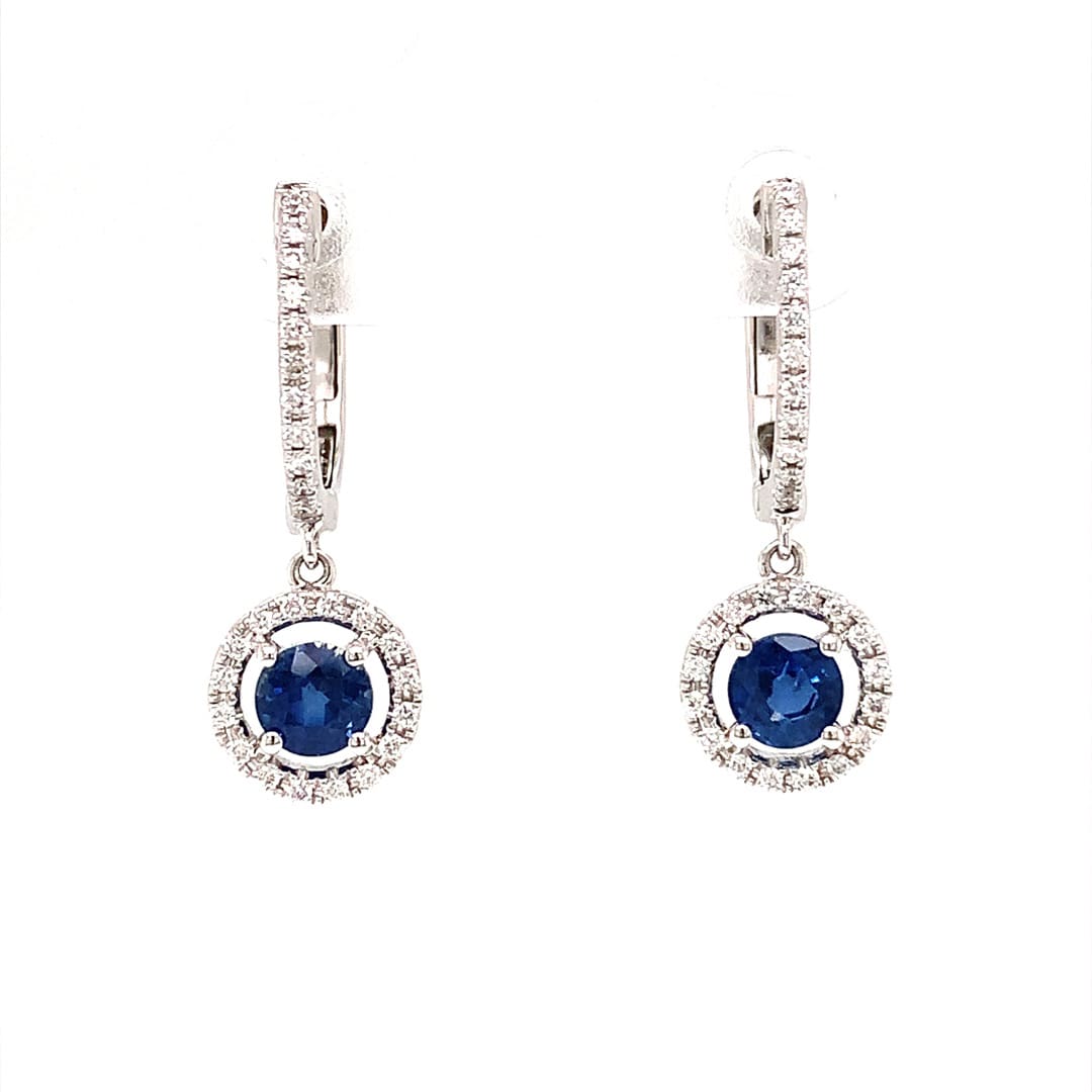 Beautiful round cut blue sapphires set within a halo of pave diamonds, paired with sparkling diamond pave hoops with a sprung-hinge closure. Total Sapphire Weight: 0.96 Carat Total Diamond Weight: 0.22 Carat Metal: 18 Carat White Gold Halo Width: 7.6 mm Hoop Width: 12.5 x 1.2 mm Fittings: Huggie style hoops with sprung hinges and [...]