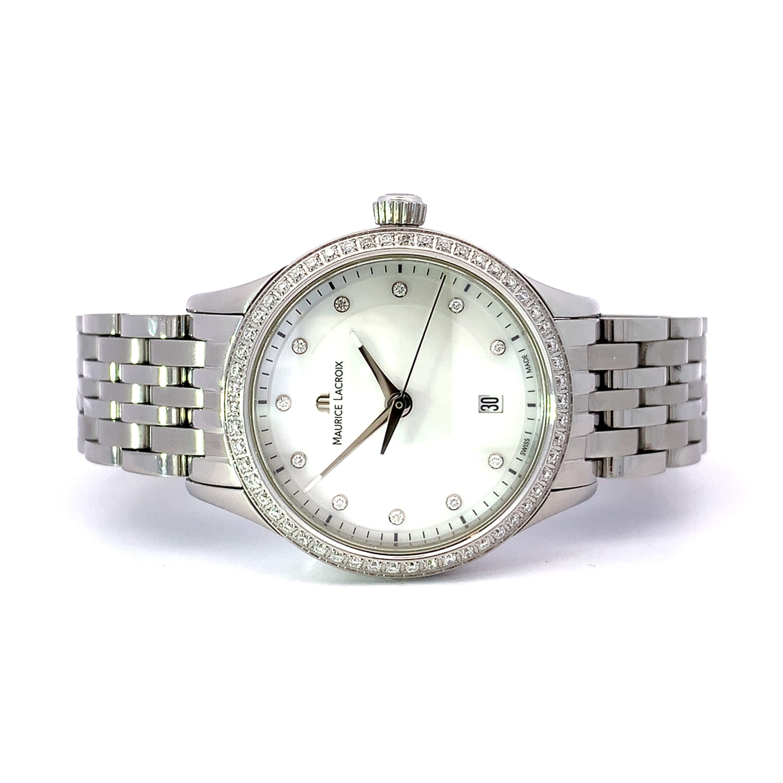 Maurice Lacroix stainless steel quartz watch with a diamond pave bezel and diamond hour markers. White mother of pearl dial with polished silver hands and a date window. Stainless steel bracelet with button release folding clasp. Model No: AT-97718 Date: 2017 Case: 28 mm Depth: 7.3 mm Wrist size: Up to approximately 18cm Water resistance: …