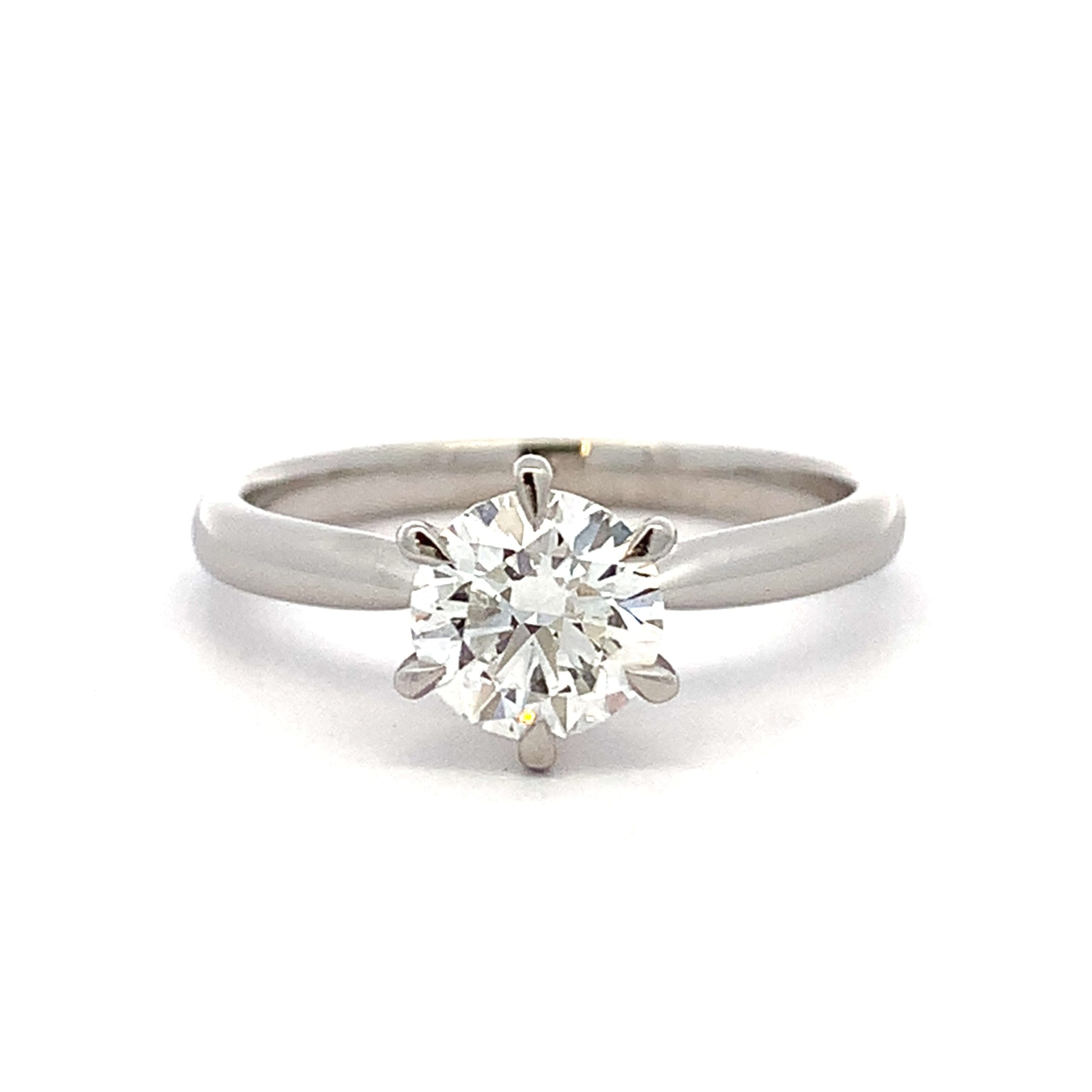 A beautiful platinum engagement ring with a bright round brilliant cut diamond in a pretty and secure six claw setting. This ring is designed to allow a wedding band to neatly under the setting. Metal: 950 Platinum. G.I.A Certificated Diamond Details: Diamond Weight: 1.01 Carat Cut: Excellent Polish: Excellent Diamond Colour and Clarity: F / …