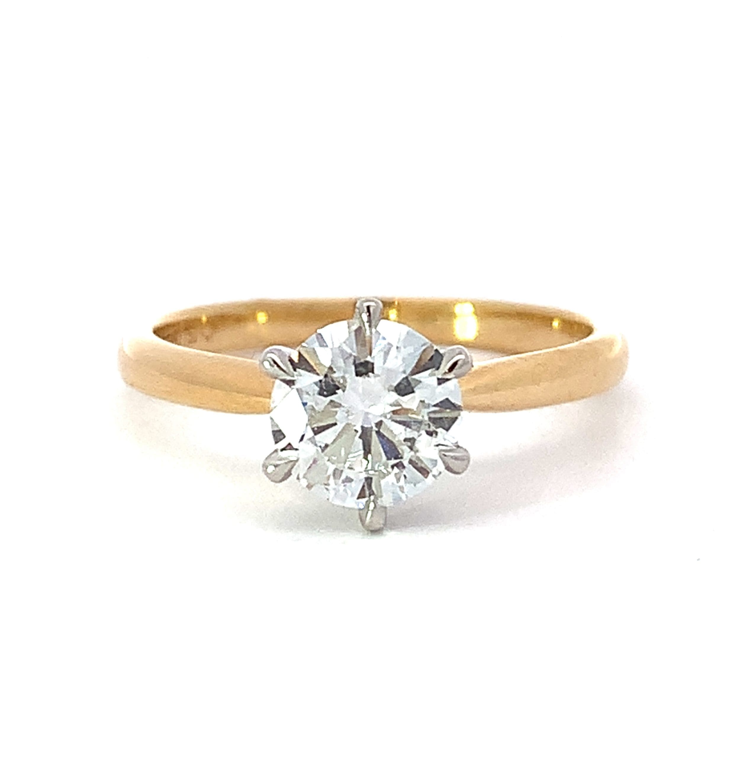 A beautiful engagement ring with a bright round brilliant cut diamond in a pretty and secure platinum six claw setting. This 18 carat yellow gold and platinum ring is designed to allow a wedding band to neatly under the setting. Metal: 18ct Yellow Gold & Platinum. G.I.A Certificated Diamond Details: Diamond Weight: 1.00 Carat Cut: …