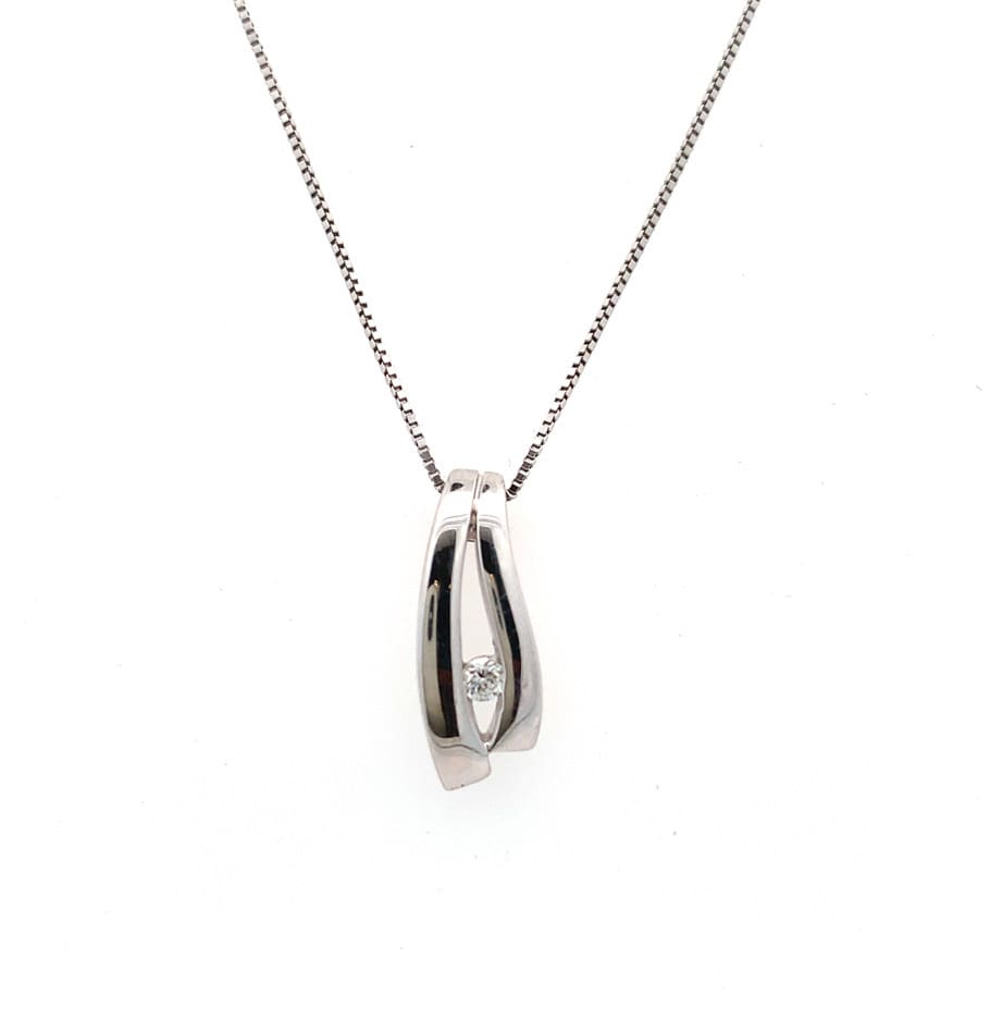 A smooth organic form pendant, set with a single round brilliant cut diamond. With a fine box chain. Metal: 950 Platinum Assessed Total Diamond Weight: 0.03 Carat Pendant Height: 14 mm This is a preowned item it has been thoroughly cleaned and polished in our workshop. Gift Boxed
