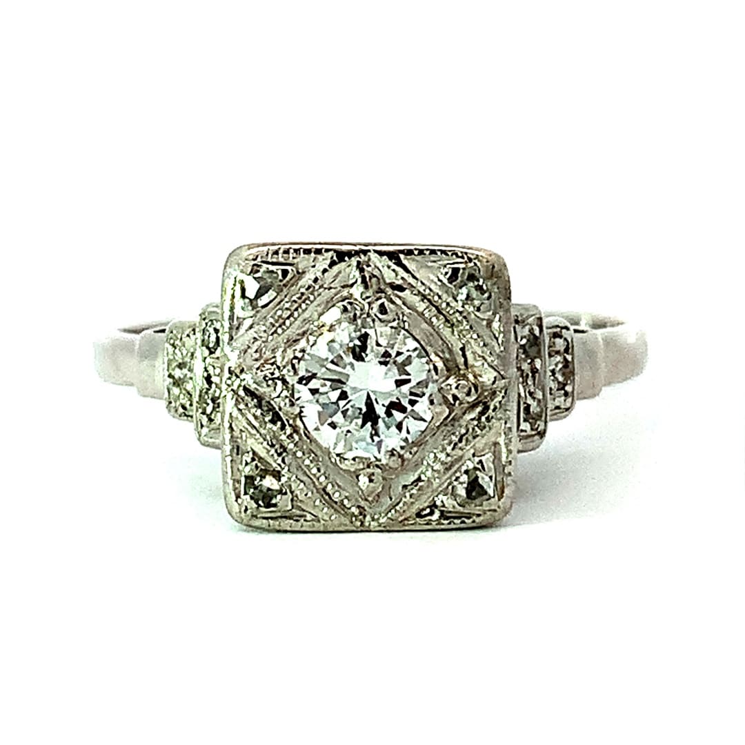 A tall vintage diamond solitaire ring with a square top that is decorated with a pierced design and fitted with diamond set shoulder plates. The engraved top is set with a central round cut 0.35 carat diamond plus four small mine-cut corner diamonds. Metal: Platinum Date: 2nd Quarter 20th Century. Centre Diamond Weight: 0.35 Carat [...]