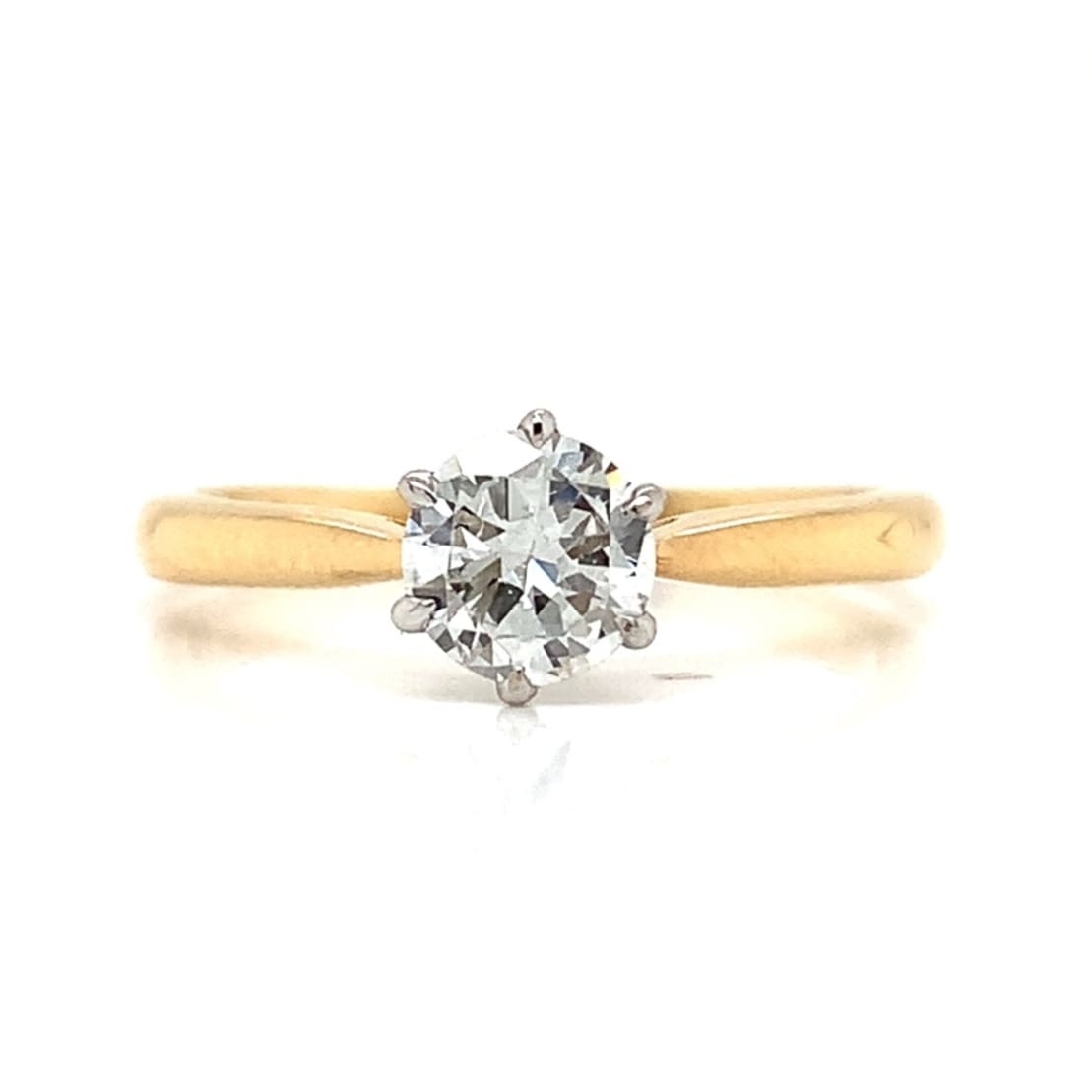 A beautiful round brilliant cut diamond with good colour and clarity in a pretty white gold six talon claw setting upon a yellow gold ring shank. Metal: 18 Carat Yellow & White Gold Diamond Weight: 0.63 Carat Diamond Colour and Clarity: G / VS2 Current Finger Size: M Gift Boxed
