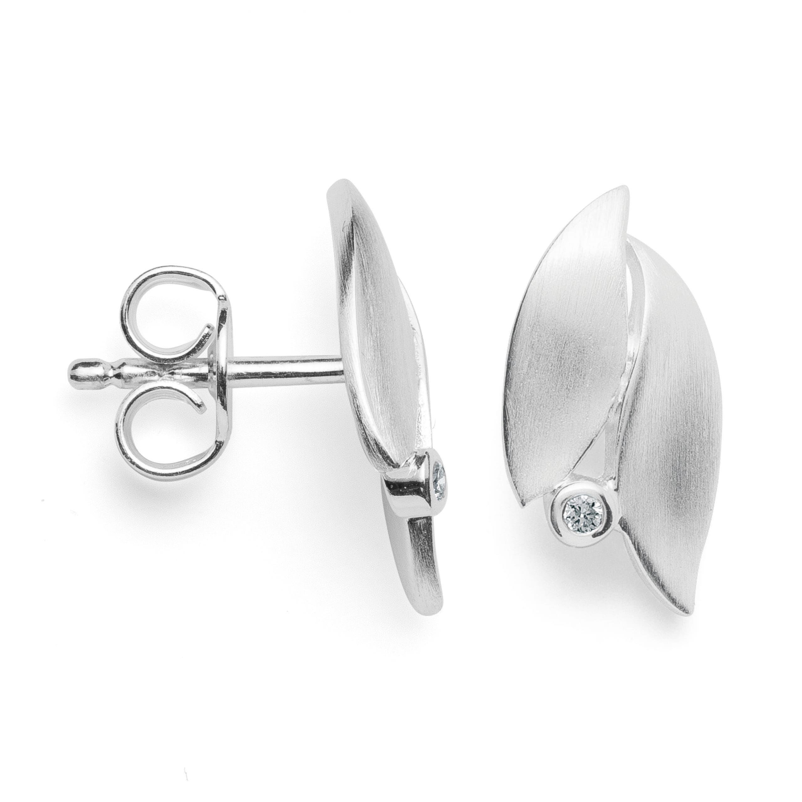 Design jewellery piece to fall in love with: these ear studs made of satin matt 925/- sterling silver convince through their organic leaf optic and the skillful arranged diamonds with 0,02ct. All bastian inverun jewellery is delivered with packaging. Measurements: Height: 13.5 mm