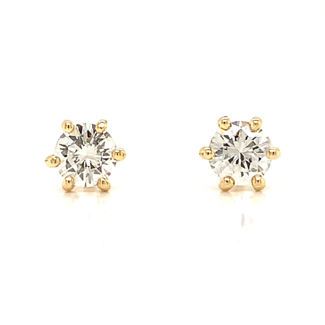 Beautiful solitaire studs rub-over set with round brilliant cut diamonds. Fitted with double click posts and secure scroll backs. Metal: 18ct Yellow Gold Total Diamond Weight: 0.41 Carat Stud Width: 4.7 mm Colour / Clarity : G /H – Vs Fittings: Posts with secure scroll backs. Gift Boxed