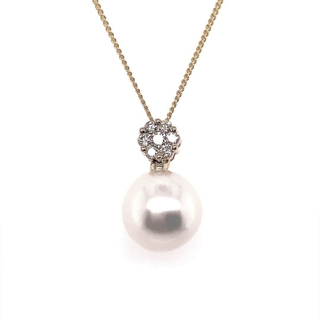 This pretty pendant necklace comprises a sliding pendant set with a cluster of seven brilliant cut diamonds and an articulated high lustre freshwater pearl. With a fine yellow gold flat curb chain. Metal: 9 Carat Yellow Gold Pearl Size: 8 mm Total Diamond Weight: 0.10Carat Length: 18 Inches Clasp: Bolt Ring Gift Boxed