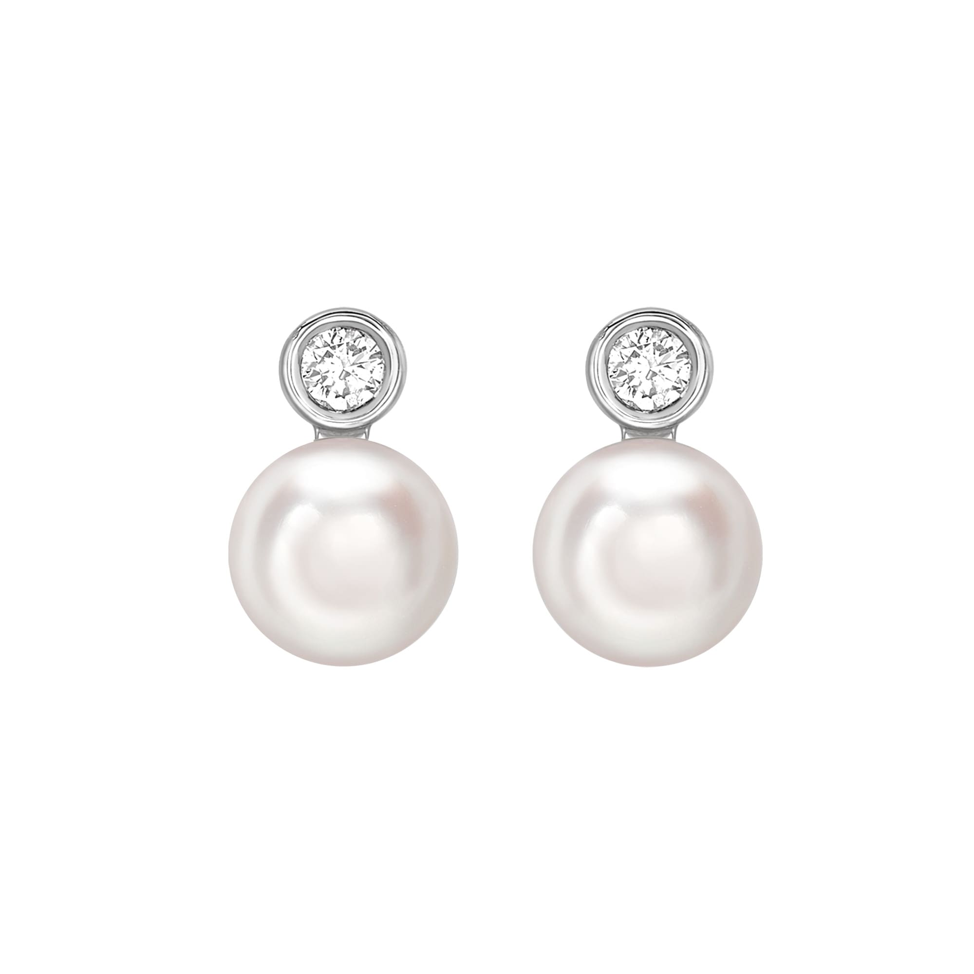 Classic stud earrings with rub-over set round brilliant cut diamonds above high lustre white cultured pearls. Metal: 18 Carat White Gold Pearl Width: 6 mm Total Diamond Weight: 0.10ct Gift Boxed