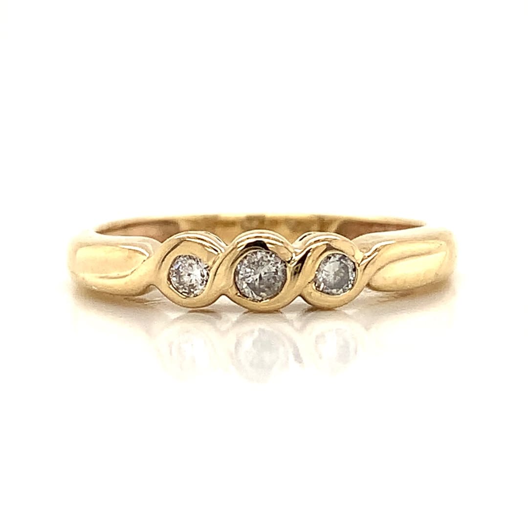 A yellow gold band style ring, rubo-over set with three round brilliant cut diamonds. Metal: 9 Carat Yellow Gold Ring Width: 3.8 mm Current Finger Size: L As a pre owned item, this ring has been examined and professionally cleaned and polished in our workshop. Gift Boxed
