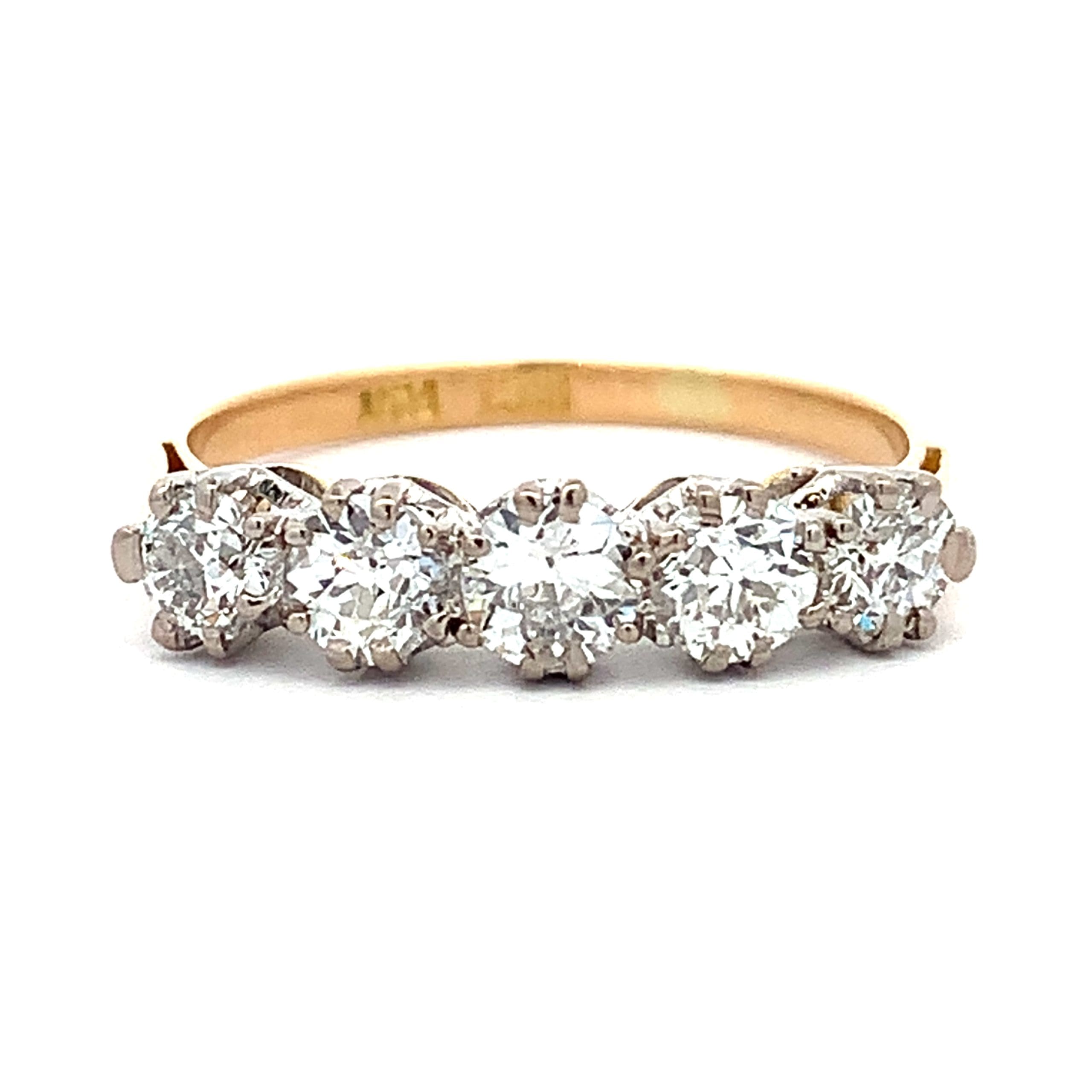 A beautiful yellow gold five stone ring claw set with bright old cut diamonds of good colour and clarity. Date: Modern Metal: 18 carat yellow gold with a white gold setting. Assessed Total Diamond Weight: 1.25 Carat Assessed Diamond Colour & Clarity: G – Si1 Ring Top Width: 4.8 mm Current Finger Size: O As …
