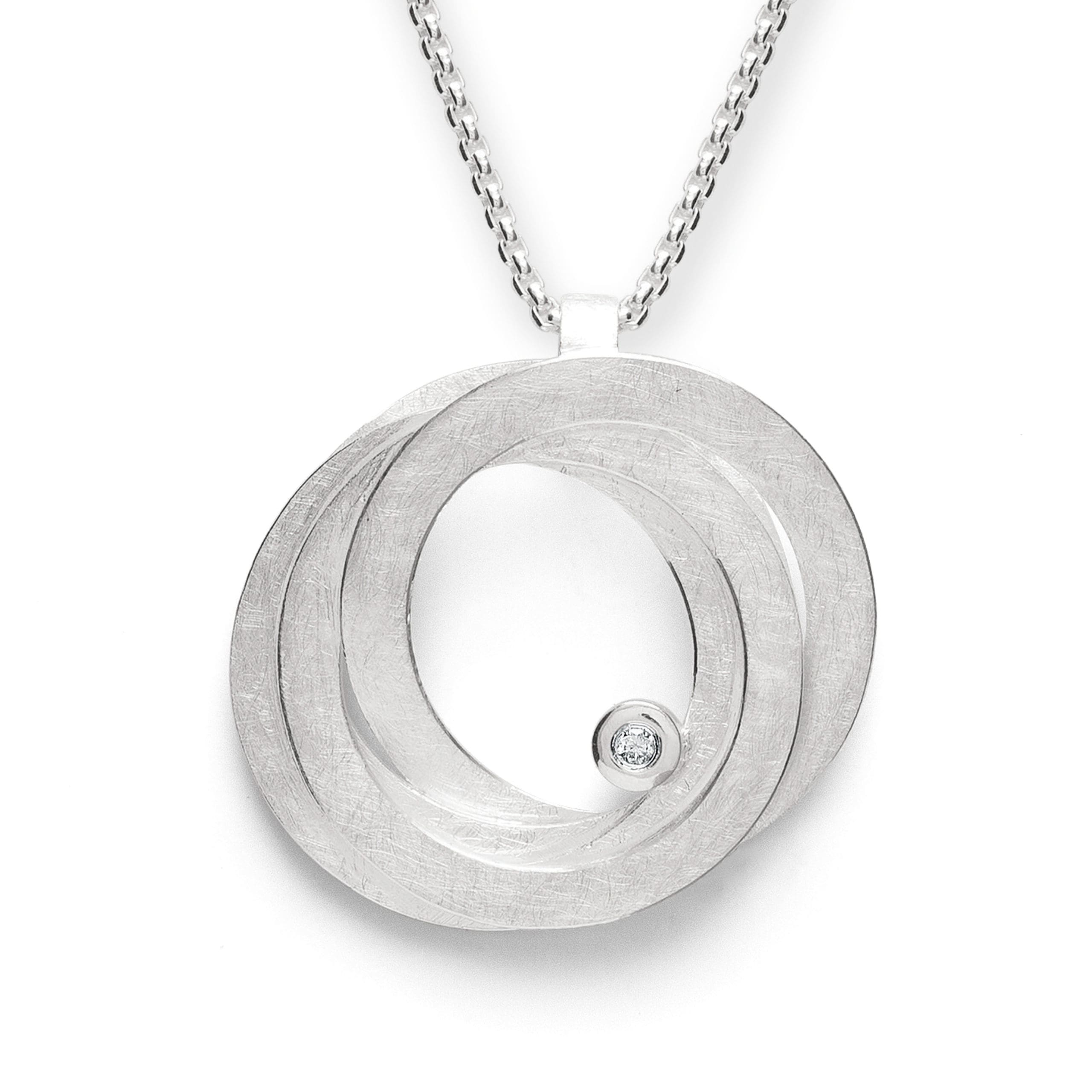 Simplistic and shiny pendant with a characteristic layering-look (designed by the German Designer Nadine Resch) and a brilliant diamond (0,02ct). Sparkling diamonds have always been a great source of pleasure. Their unique character enthrals us and turns every piece of jewellery, especially in combination with fine sterling silver, into an everlasting treasure. Their typical sheen, …