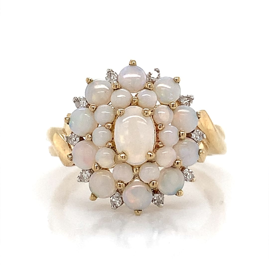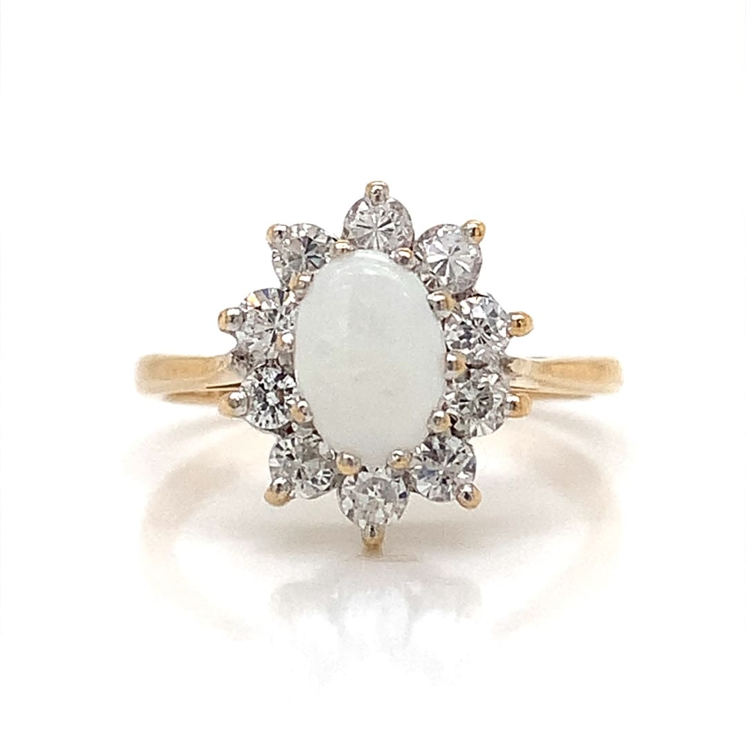 A gold pendant and chain with an oval opal cabochon in a pretty clawed pendant with accent diamonds above. Metal: 9ct Yellow Gold Pendant Width: 5 mm Chain: Adjustable – 16 or 18 Inches Gift Boxed