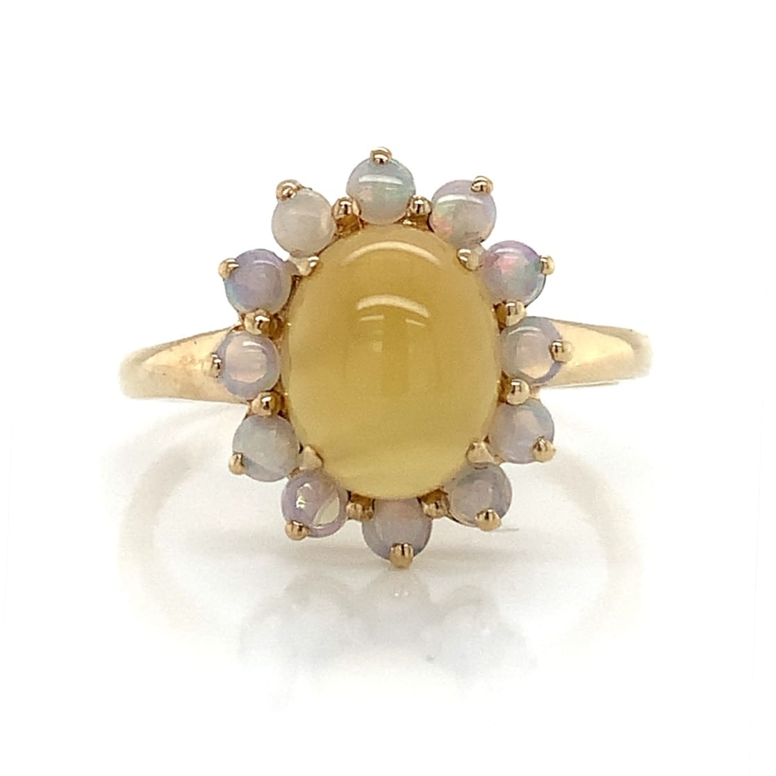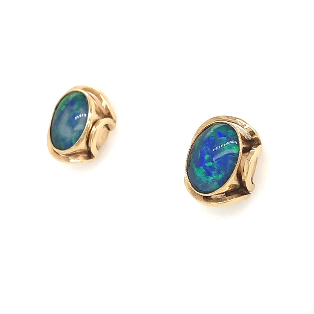 Opal cabochons in pretty yellow gold clawed settings. Metal: 9 Carat Yellow Gold Width: 4.2 mm Fittings: Posts and scroll backs. Gift Boxed