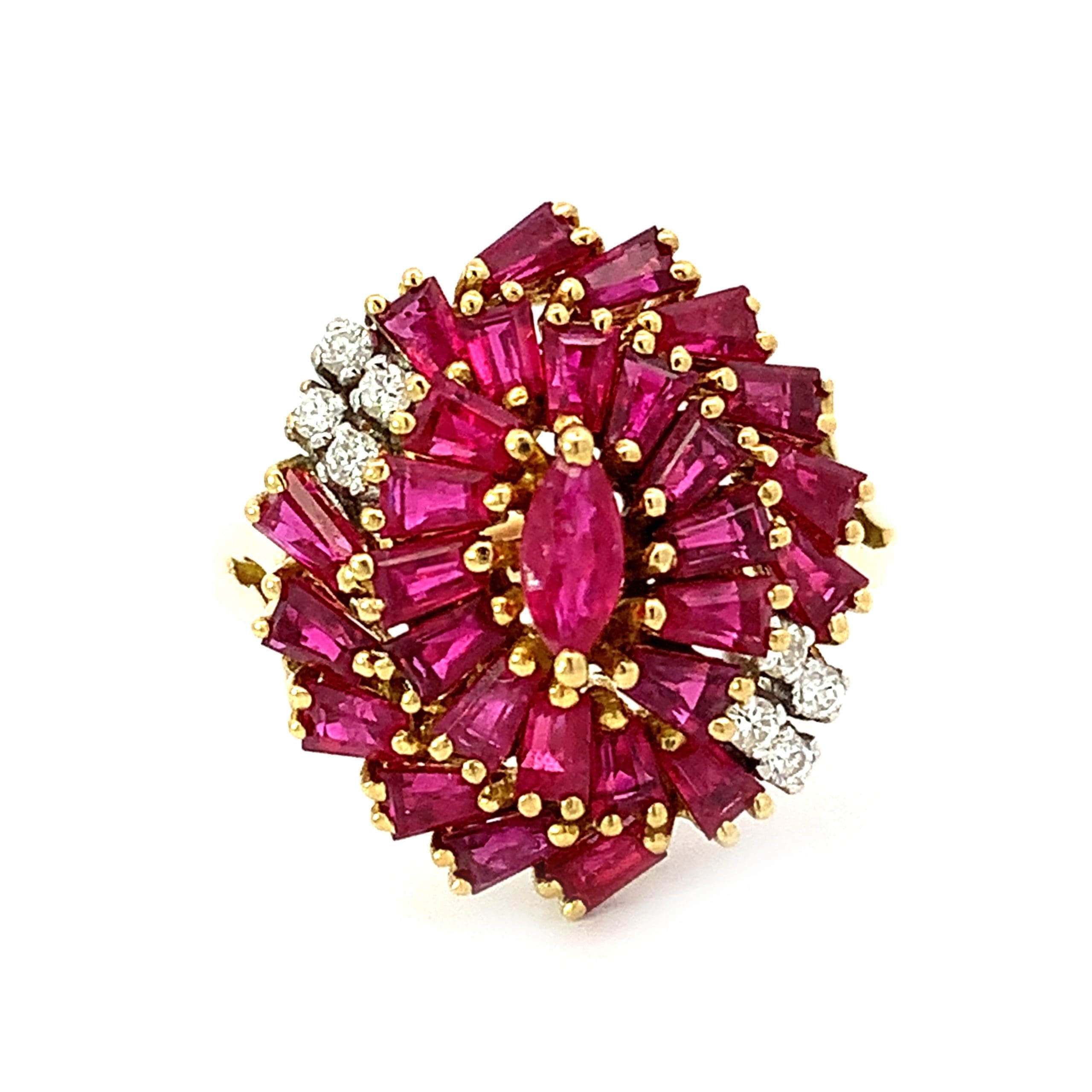 A large cluster of fan-tail baguette cut ruby and round brilliant cut diamond all claw set in yellow gold. Metal: 18ct Yellow Gold Date: Modern Ring Top Dimensions: 18.5 x 16.2 mm Finger Size: N As a pre owned item, this ring has been examined and professionally cleaned and polished in our workshop. Gift Boxed