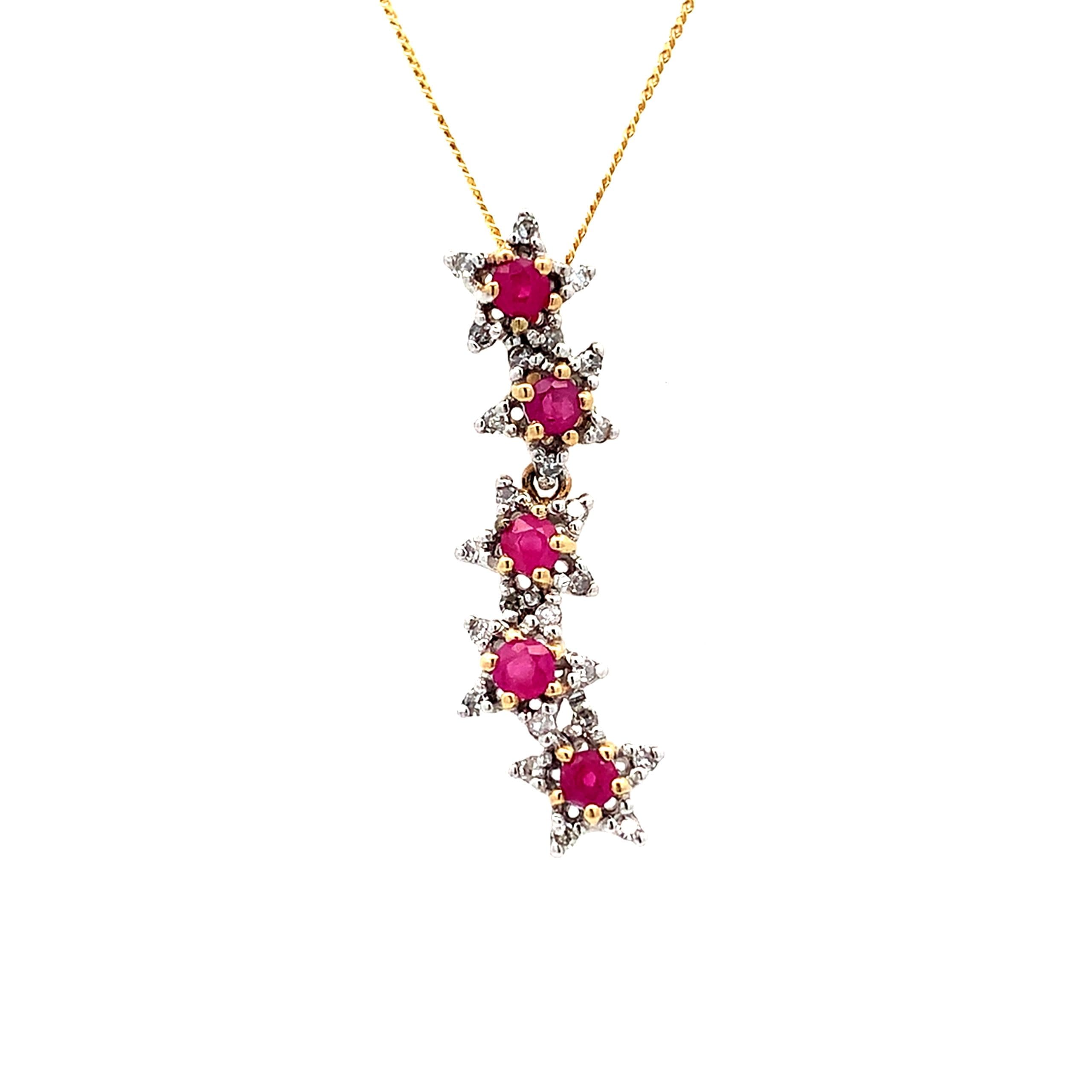 A pretty multi-star drop pendant set with ruby and diamond. Comes on a fine curb link chain. Metal: 9 Carat Yellow & White Gold Date: Modern Pendant Length: 29 mm Chain Length: 18 Inches Clasp: Bolt ring. As a preowned item, this necklace has been examined and professionally cleaned and polished in our workshop. Gift …