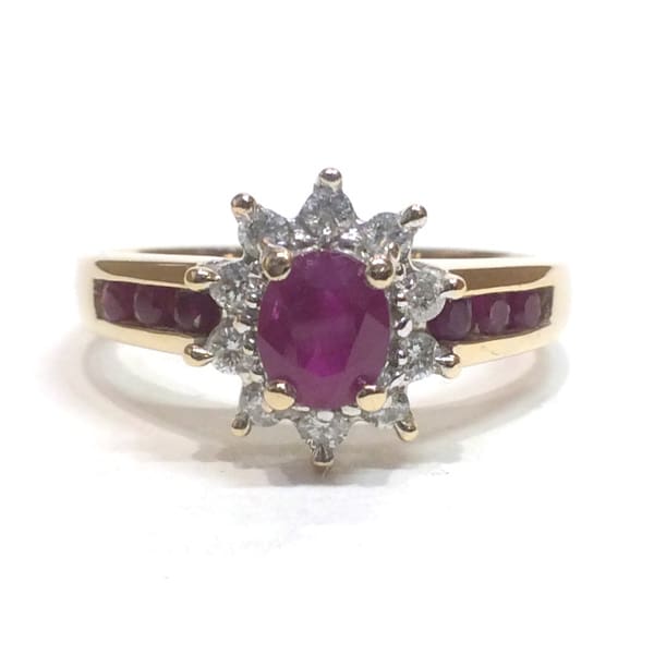 A traditional Ruby and Diamond cluster ring with added channel set Ruby shoulders. Metal: 9 Carat Yellow Gold Date: Modern Assessed Total Diamond Weight: 0.18 Carat Ruby Dimensions: 5 x 4 mm Finger Size: M1/2 As a pre owned item, this ring has been examined and professionally cleaned and polished in our workshop. Gift Boxed