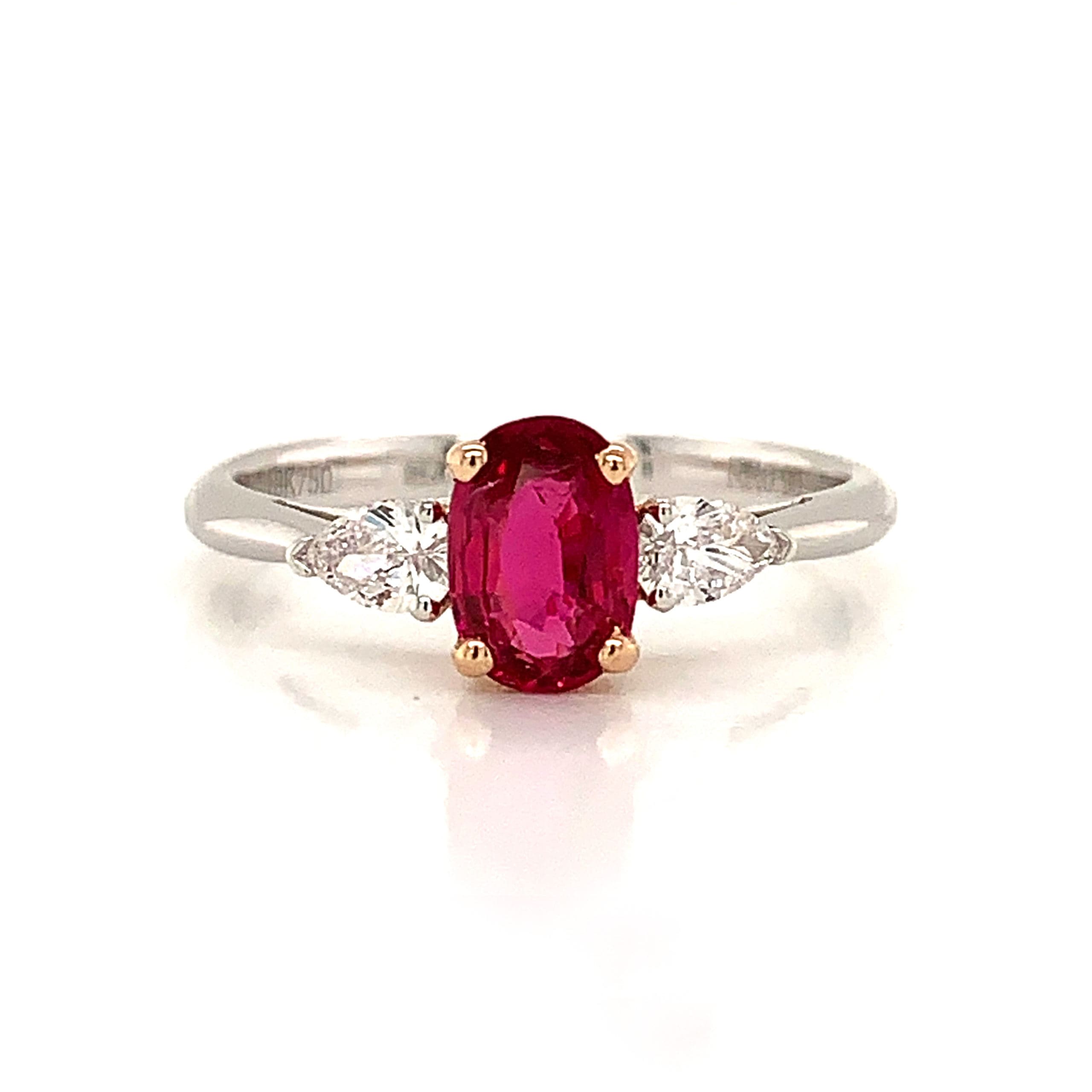 A pretty yellow gold band, claw set with a vibrant oval cut Ruby and two bright brilliant cut Diamonds. Metal: 18 Carat yellow Gold Ruby Weight: 0.46 Carat Total Diamond Weight: 0.12 Carat Diamond Colour and Clarity: G / Vs Finger Size: L Gift Boxed