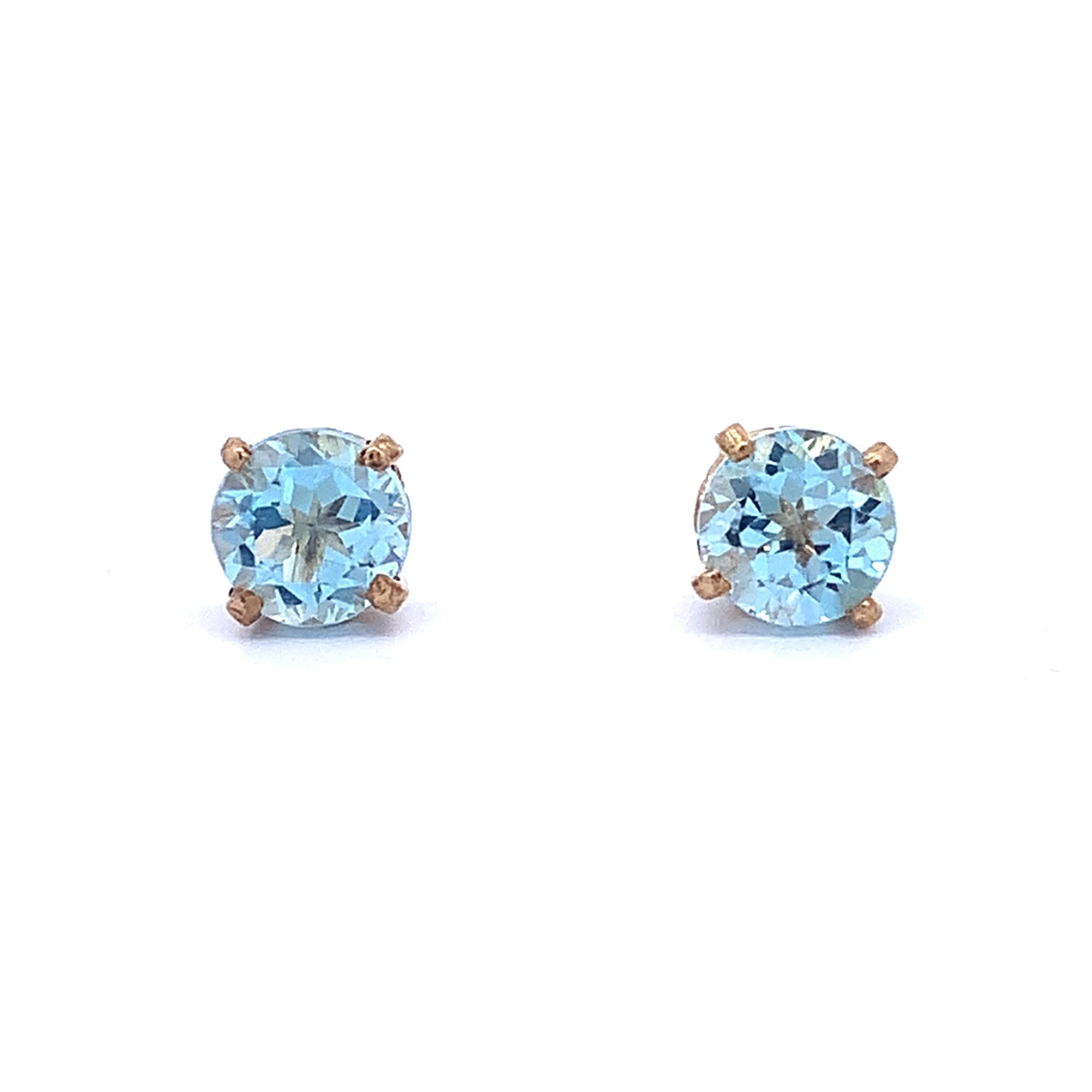 Softly glittering round cut blue topaz claw set in 9 carat yellow gold studs. Width: 6 mm Fittings: Posts and scroll backs. As a preowned item this pair of earrings have been professionally cleaned and polished in our workshop. Gift Boxed