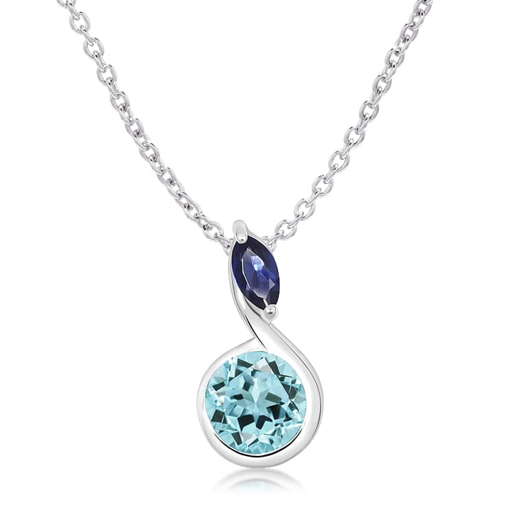 A lovely silver pendant and chain set with round cut blue topaz and marquise cut iolite. 925 Sterling Silver. Pendant Width: 8.8 mm Chain Length: 17 – 18 Inches Gift Boxed