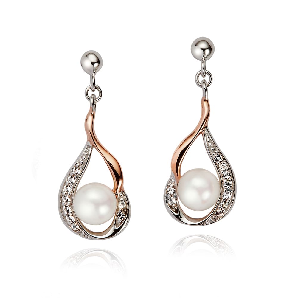 Organic droplets, each with a single Freshwater pearl, shimmer with light. This gorgeous collection is the perfect choice for any occasion. Freshwater pearl and white topaz on silver and rose gold plated sterling silver. Height: 23 mm Gift Boxed
