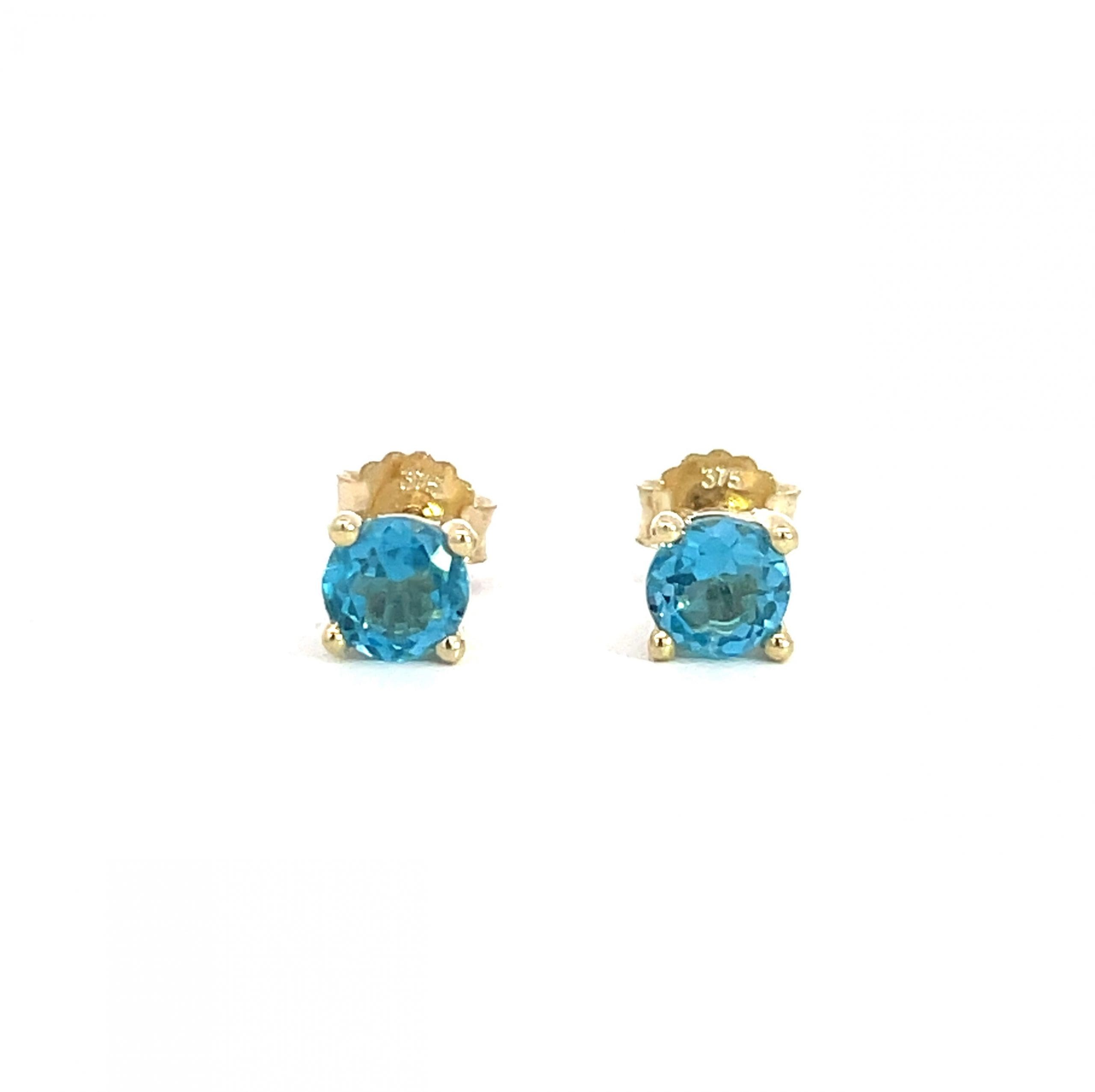 Round cut blue topaz in simple four claw yellow gold settings. Metal: 9 Carat Yellow Gold Fittings: Posts and Scroll backs. Width: 5.2 mm Gift Boxed