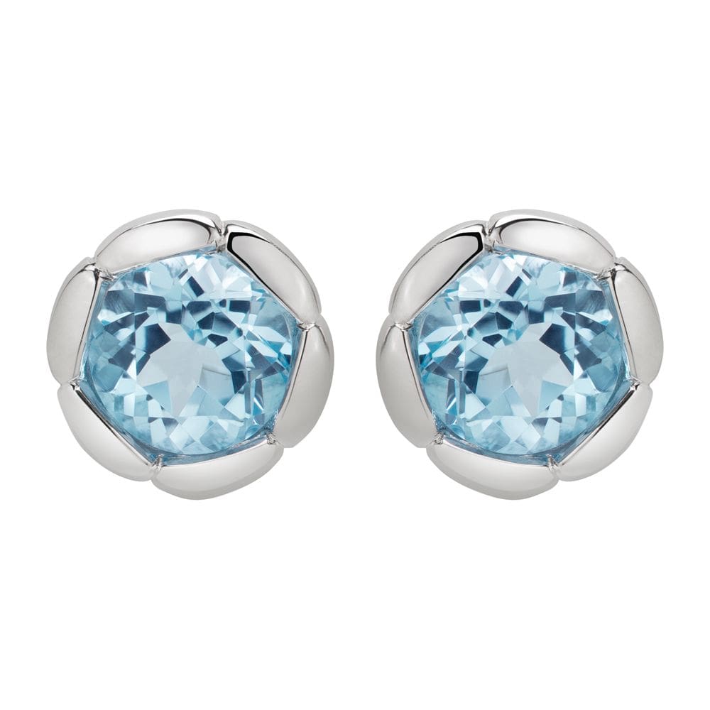 Sparkling round cut blue topaz in a modern flower form stud. 925 sterling silver. Width: 8.5 mm Posts and scroll back fittings. Gift Boxed