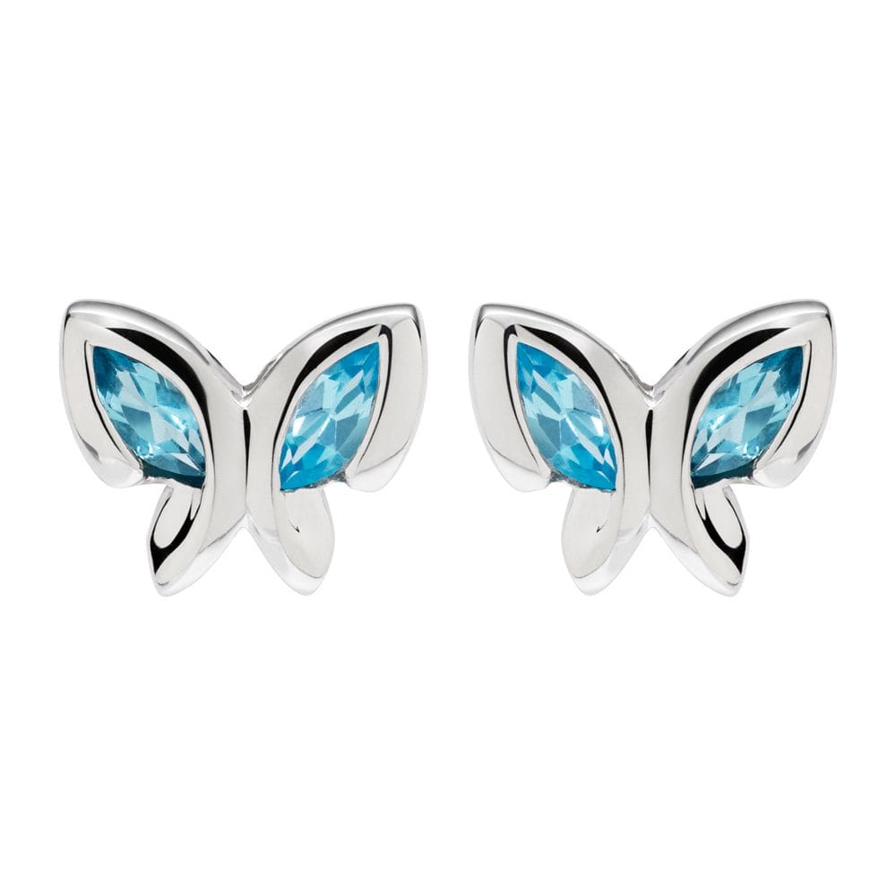Sparkling marquise cut blue topaz in a butterfly stud. 925 sterling silver. Width: 8.5 mm Posts and scroll back fittings. Gift Boxed