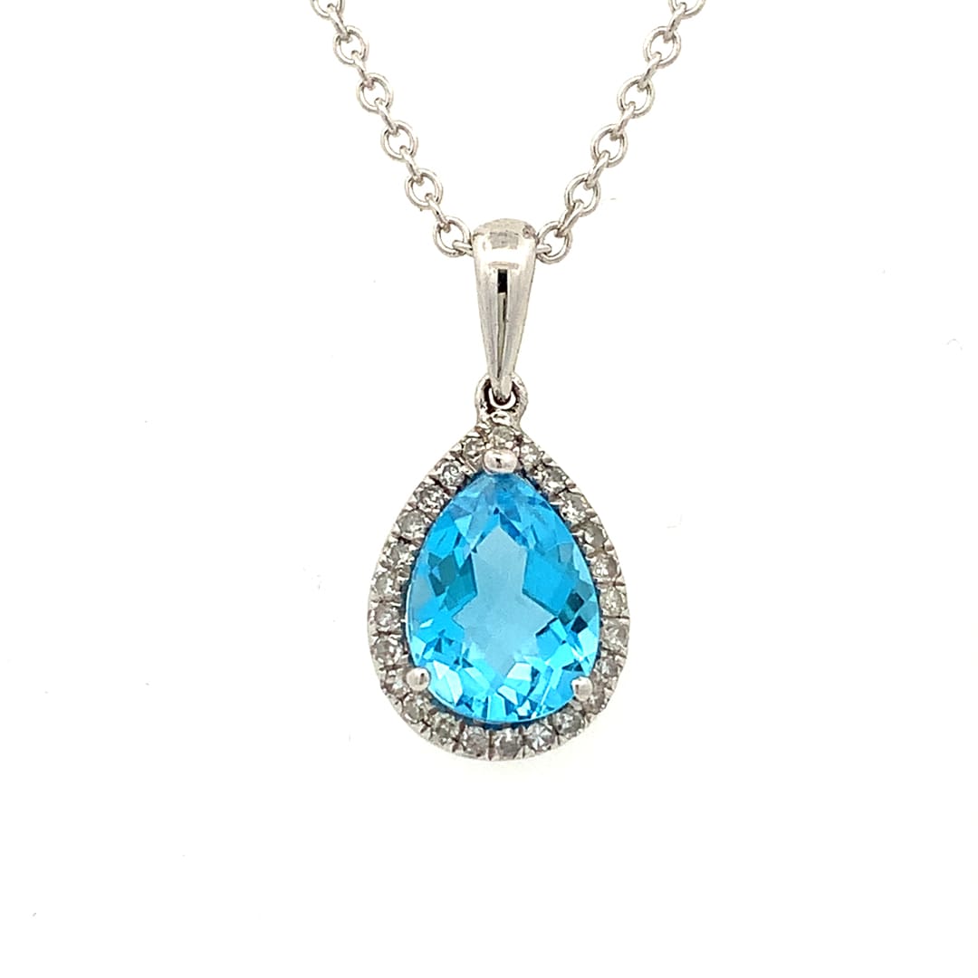 A beautiful smooth rub-over set white gold pendant and chain with pear cut swiss blue topaz and round brilliant cut diamond. Metal: 9ct White Gold Diamond Weight: 0.09 Carat Pendant Width: 8.8 mm Chain: Adjustable – 16, 17 or 18 inches. Gift Boxed