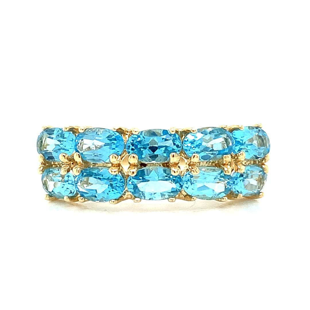 A lovely yellow gold dress ring claw set with an pear cut blue topaz and round cut diamonds. Metal: 9 Carat Yellow Gold Current Finger Size: J Cluster Dimensions: 13 x 10 mm As a pre-owned item, this ring has been examined and professionally cleaned and polished in our workshop. Gift Boxed