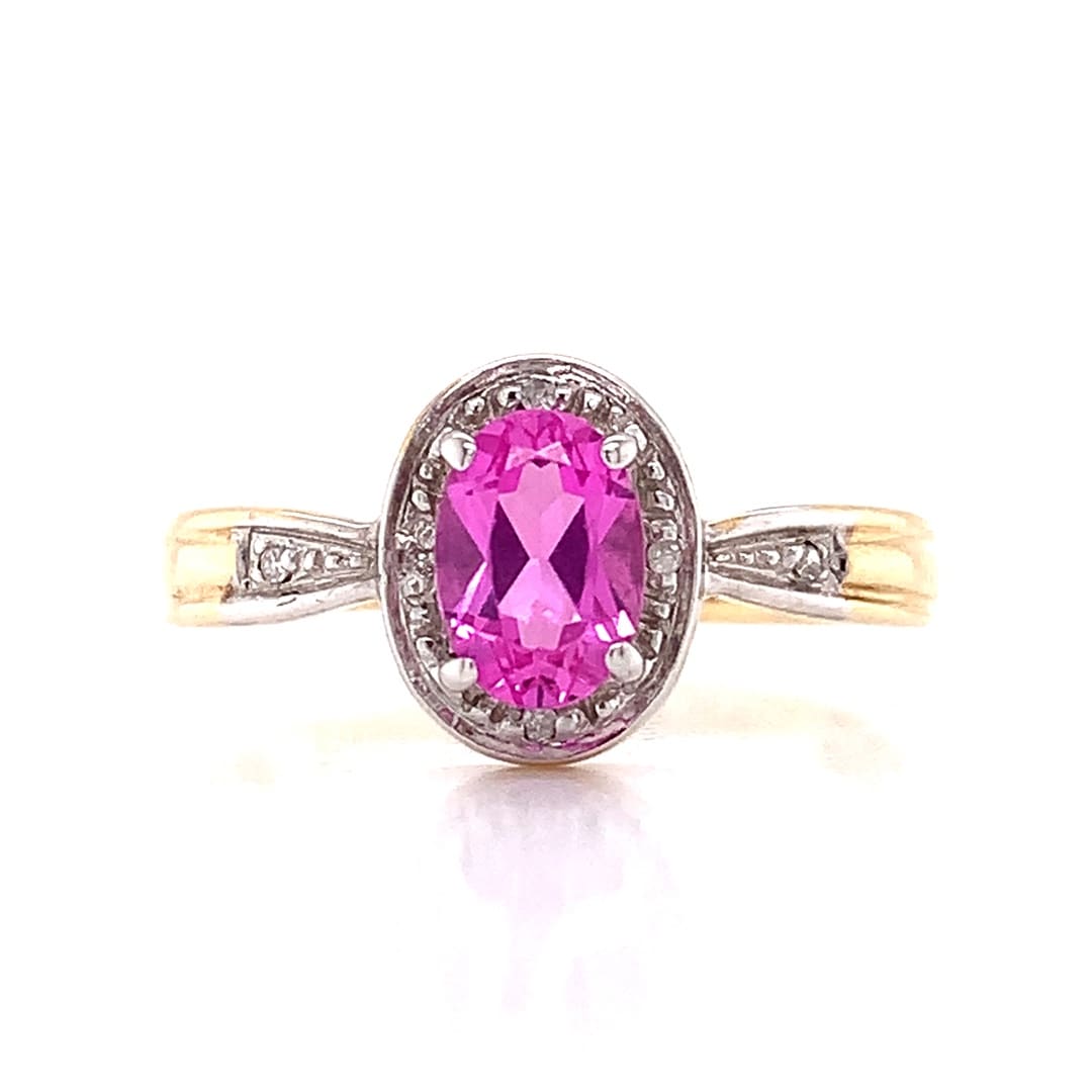 A pretty oval cut pink topaz dress ring with an illusion diamond halo setting. Date: Modern Metal: 9 Carat Yellow Gold Finger Size: P – This ring is unsuitable for resizing. As a pre owned item, this ring has been examined and professionally cleaned and polished in our workshop. Gift Boxed