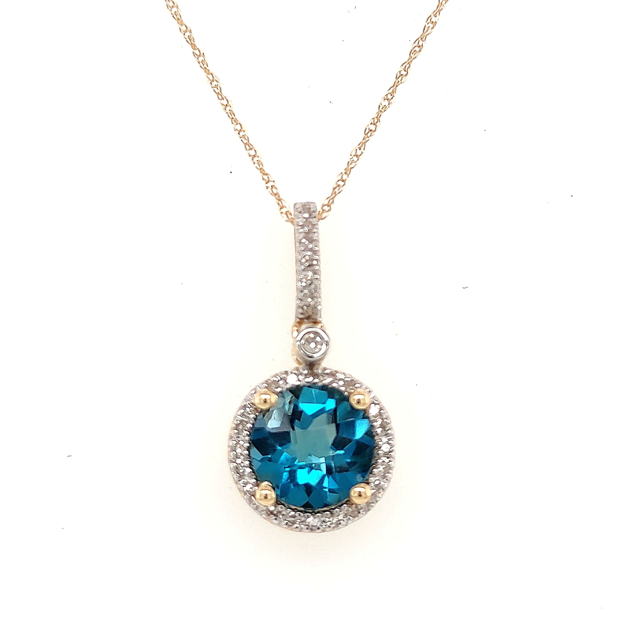 This is an elegant 14 carat yellow gold necklace, comprising of a round cut London Blue Topaz surrounded by a Halo of round cut diamonds with a diamond set bale, on a prince of wales pendant chain. Chain Length: 18″ Diamond Weight: 0.11 Carat Pendant Dimensions: 11mm This is a pre-owned item, it has been …