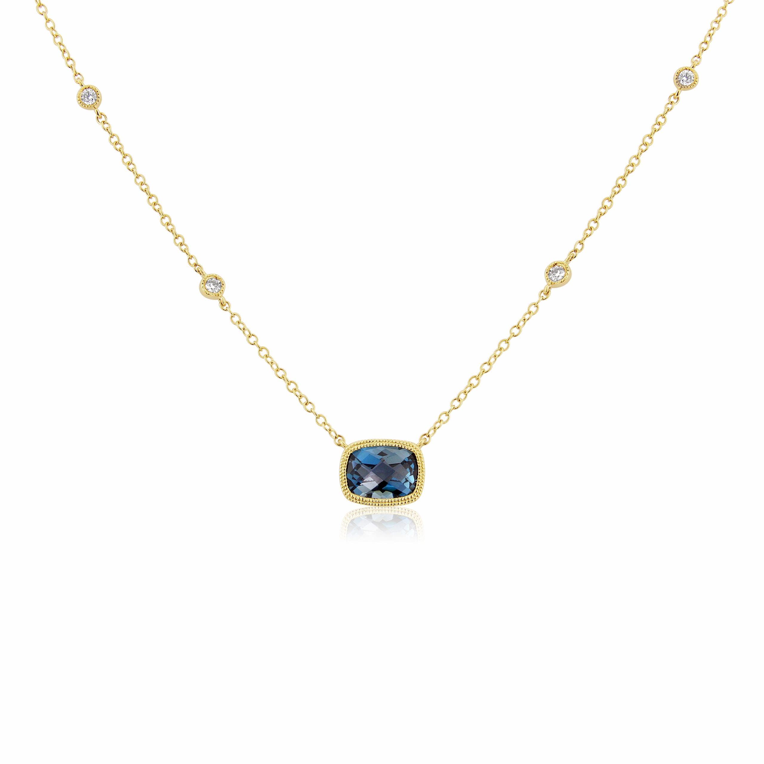 A beautiful gold pendant and chain set with a sparkling fancy cut london blue topaz in a rub-over setting with a mill-grain edge and added diamonds within the chain with matching settings. Metal: 9ct Yellow Gold Pendant Width: 8 mm Chain: Adjustable – 16 or 18 Inches Gift Boxed